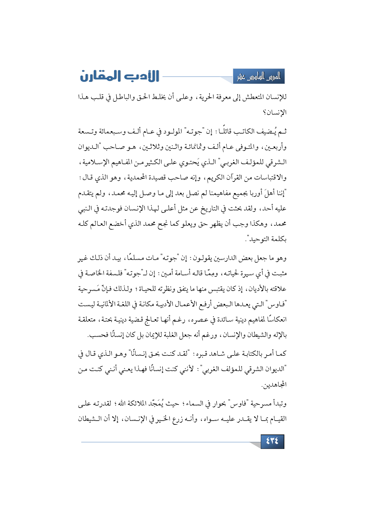 ثم يُضيف الكاتب قائلًا: إن "جوته" المولود في عام ألف وسبعمائة وتسعة وأربعين، والمتوفى عام ألف وثمانمائة واثنين وثلاثين، هو صاحب "الديوان الشرقي للمؤلف الغربي" الذي يَحتوي على الكثير من المفاهيم الإسلامية، والاقتباسات من القرآن الكريم، وإنه صاحب قصيدة المحمدية، وهو الذي قال: "إننا أهلَ أوربا بجميع مفاهيمنا لم نصل بعد إلى ما وصل إليه محمد، ولم يتقدم عليه أحد، ولقد بحثت في التاريخ عن مثل أعلى لهذا الإنسان فوجدته في النبي محمد، وهكذا وجب أن يظهر حق ويعلو كما نجح محمد الذي أخضع العالم كله بكلمة التوحيد".
