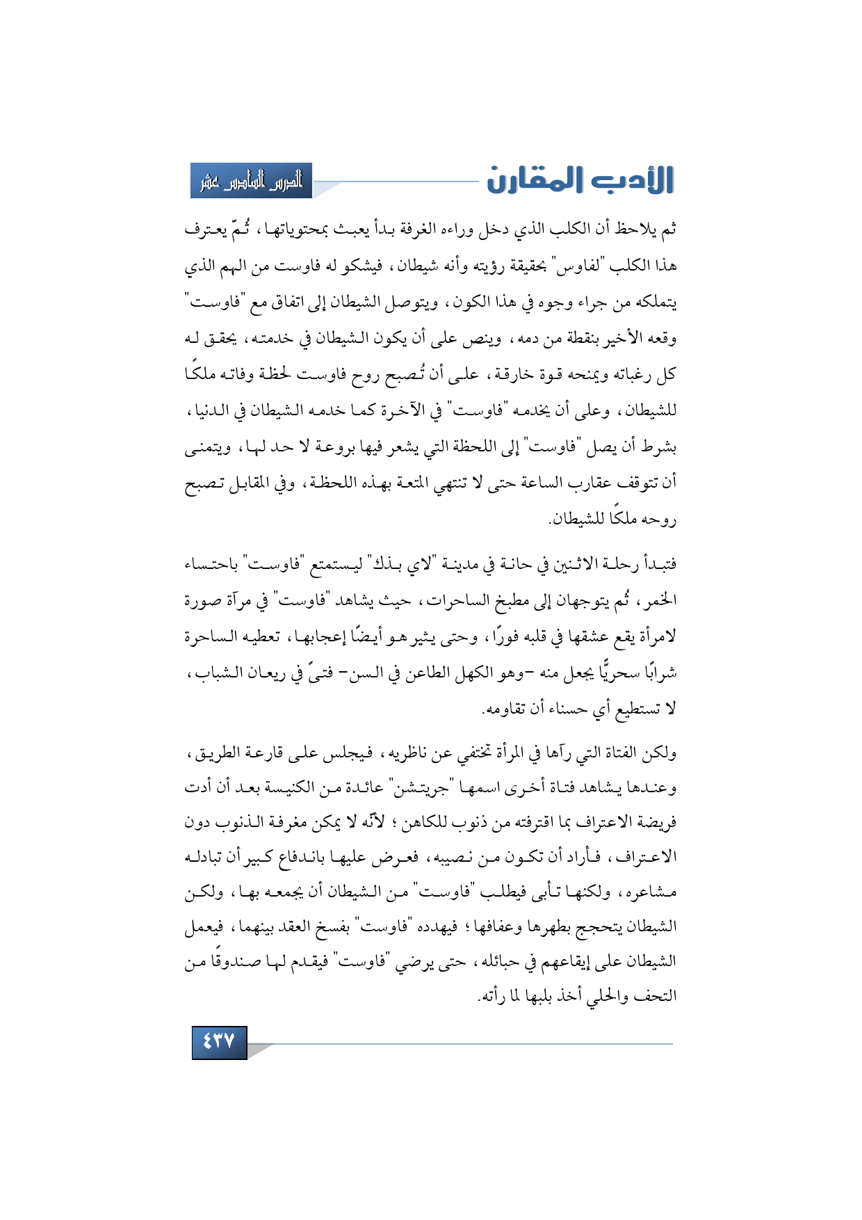 ثم يلاحظ أن الكلب الذي دخل وراءه الغرفة بدأ يعبث بمحتوياتها، ثُمّ يعترف هذا الكلب "لفاوس" بحقيقة رؤيته وأنه شيطان، فيشكو له فاوست من الهم الذي يتملكه من جراء وجوه في هذا الكون، ويتوصل الشيطان إلى اتفاق مع "فاوست" وقعه الأخير بنقطة من دمه، وينص على أن يكون الشيطان في خدمته، يحقق له كل رغباته ويمنحه قوة خارقة، على أن تُصبح روح فاوست لحظة وفاته ملكًا للشيطان، وعلى أن يخدمه "فاوست" في الآخرة كما خدمه الشيطان في الدنيا، بشرط أن يصل "فاوست" إلى اللحظة التي يشعر فيها بروعة لا حد لها، ويتمنى أن تتوقف عقارب الساعة حتى لا تنتهي المتعة بهذه اللحظة، وفي المقابل تصبح روحه ملكًا للشيطان.