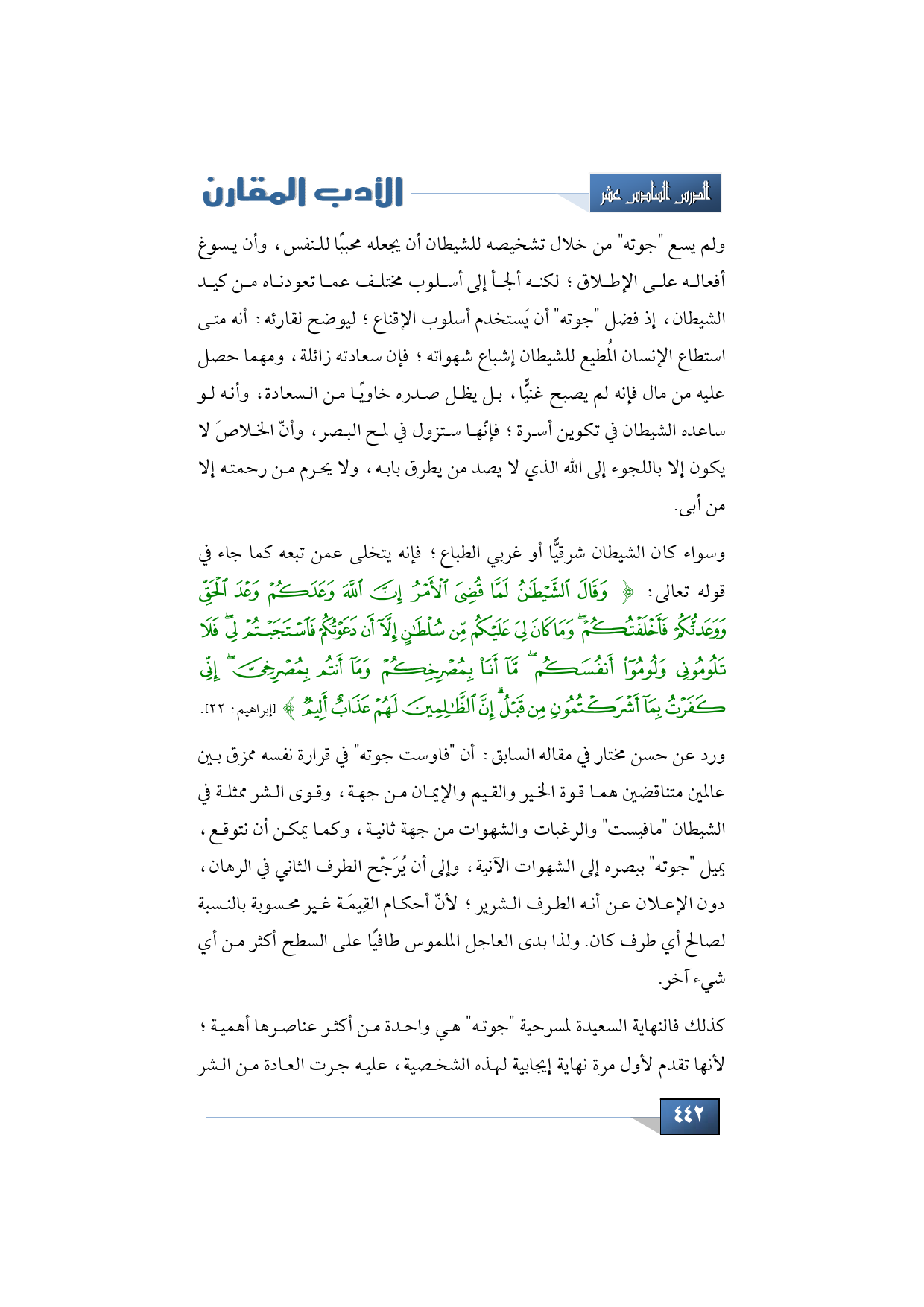 ولم يسع "جوته" من خلال تشخيصه للشيطان أن يجعله محببًا للنفس، وأن يسوغ أفعاله على الإطلاق؛ لكنه ألجأ إلى أسلوب مختلف عما تعودناه من كيد الشيطان، إذ فضل "جوته" أن يَستخدم أسلوب الإقناع ليوضح به لقارئه أنه متى استطاع الإنسان المُطيع للشيطان إشباع شهواته؛ فإن سعادته زائلة، ومهما حصل عليه من مال فإنه لم يصبح غنيًّا، بل يظل صدره خاويًا من السعادة، وأنه لو ساعده الشيطان في تكوين أسرة؛ فإنّها ستزول في لمح البصر، وأنّ الخلاصَ لا يكون إلا باللجوء إلى الله الذي لا يصد من يطرق بابه، ولا يحرم من رحمته إلا من أبى.