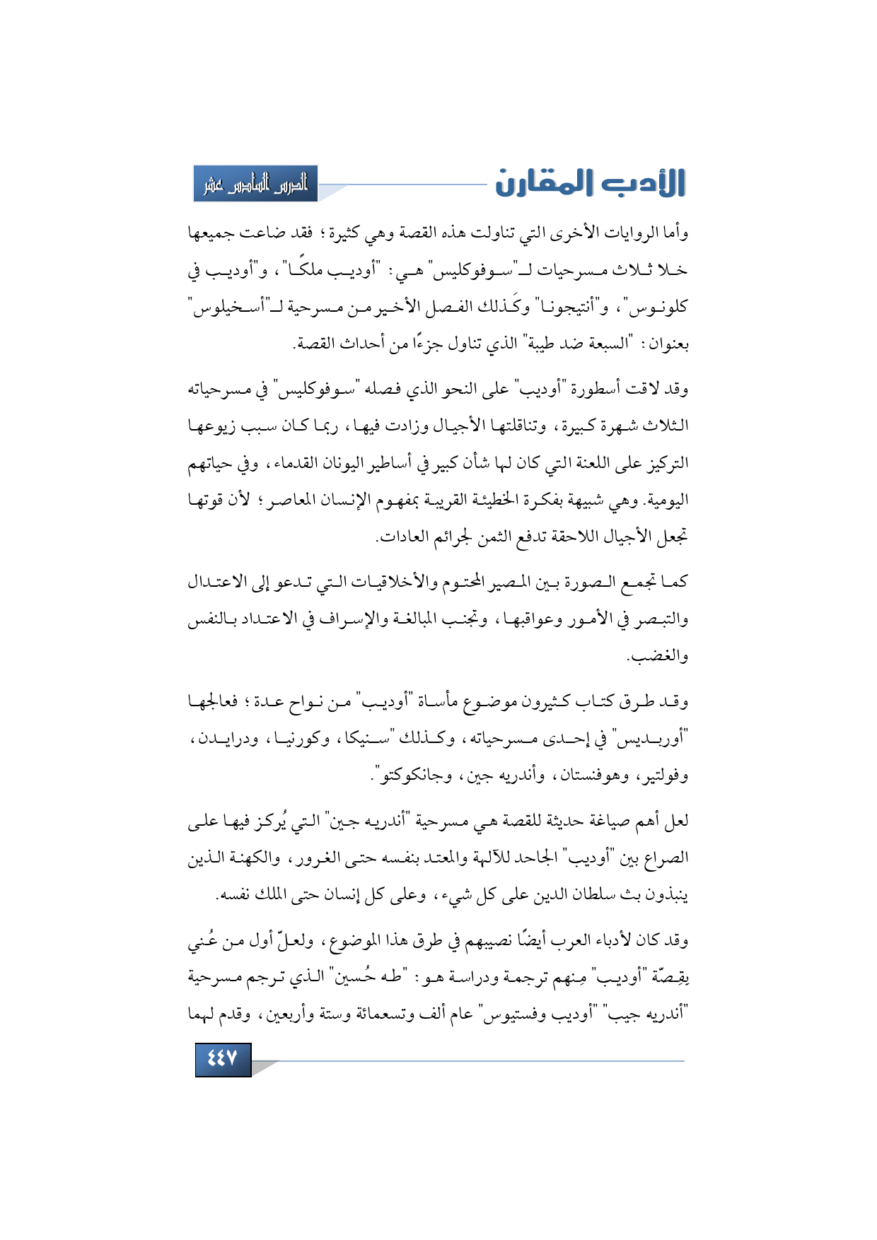 وقد كان لأدباء العرب أيضًا نصيبهم في طرق هذا الموضوع، ولعلّ أول من عُني بِقِصّة "أوديب" مِنهم ترجمة ودراسة هو "طه حُسين" الذي ترجم مسرحية "أندريه جيب أوديب وفستيوس" عام ألف وتسعمائة وستة وأربعين، وقدم لهما