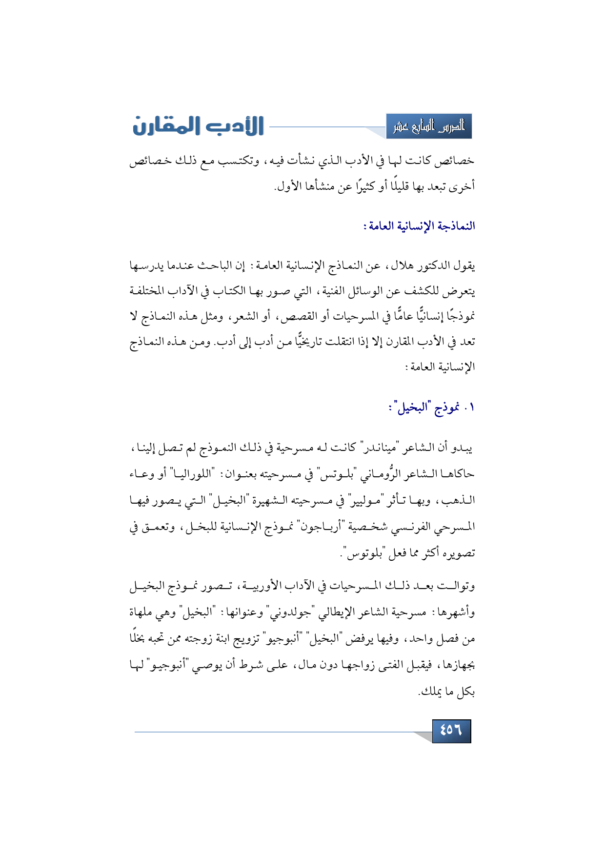 ويقول الدكتور هلال، عن النماذج الإنسانية العامة: إن الباحث عندما يدرسها يتعرض للكشف عن الوسائل الفنية، التي صور بها الكتاب في آداب المختلفة نموذجًا إنسانيًّا عامًّا في المسرحيات أو القصص، أو الشعر، ومثل هذه النماذج لا تعد في الأدب المقارن إلا إذا انتقلت تاريخيًّا من أدب إلى أدب.