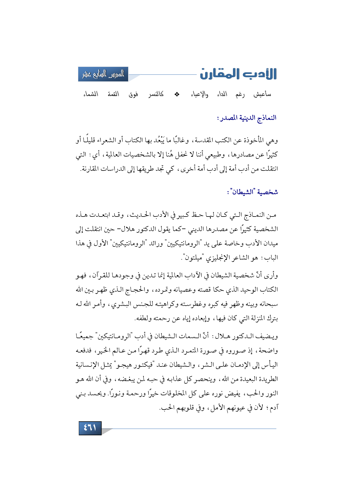 ومن النماذج التي كان لها حظ كبير في الأدب الحديث شخصية "الشيطان" وقد ابتعدت هذه الشخصية كثيرًا عن مصدرها الديني -كما يقول الدكتور هلال- حين انتقلت إلى ميدان الأدب وخاصة على يد "الرومانتيكيين" ورائد "الرومانتيكيين" الأول في هذا الباب هو الشاعر الإنجليزي "ميلتون".