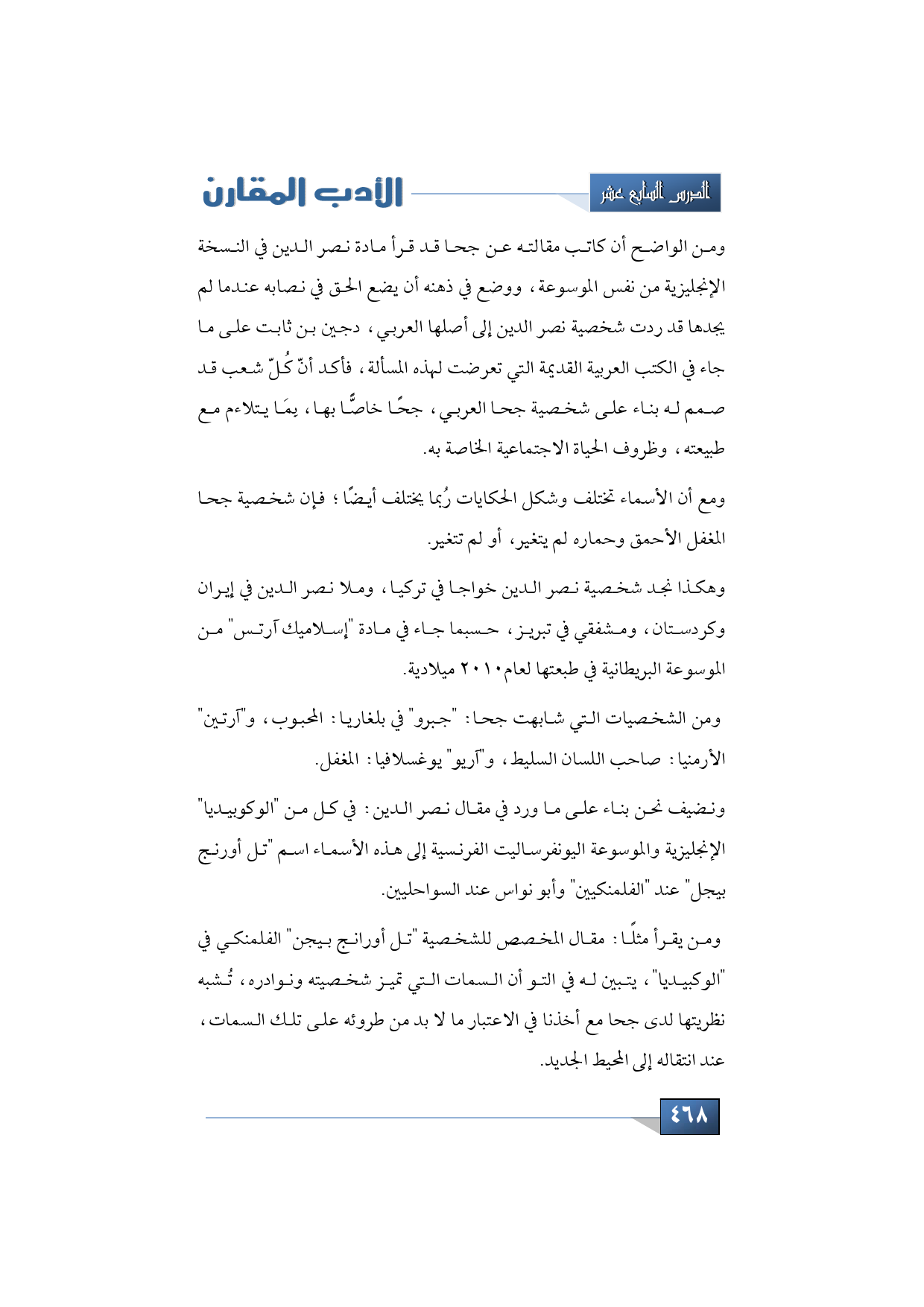 ومن الواضح أن كاتب مقالته عن جحا قد قرأ مادة نصر الدين في النسخة الإنجليزية من نفس الموسوعة، ووضع في ذهنه أن يضع الحق في نصابه عندما لم يجدها قد ردت شخصية نصر الدين إلى أصلها العربي، دجين بن ثابت على ما جاء في الكتب العربية القديمة التي تعرضت لهذه المسألة، فأكد أنّ كُلّ شعب قد صمم له بناء على شخصية جحا العربي، جحًا خاصًّا بها، بِمَا يتلاءم مع طبيعته، وظروف الحياة الاجتماعية الخاصة به.