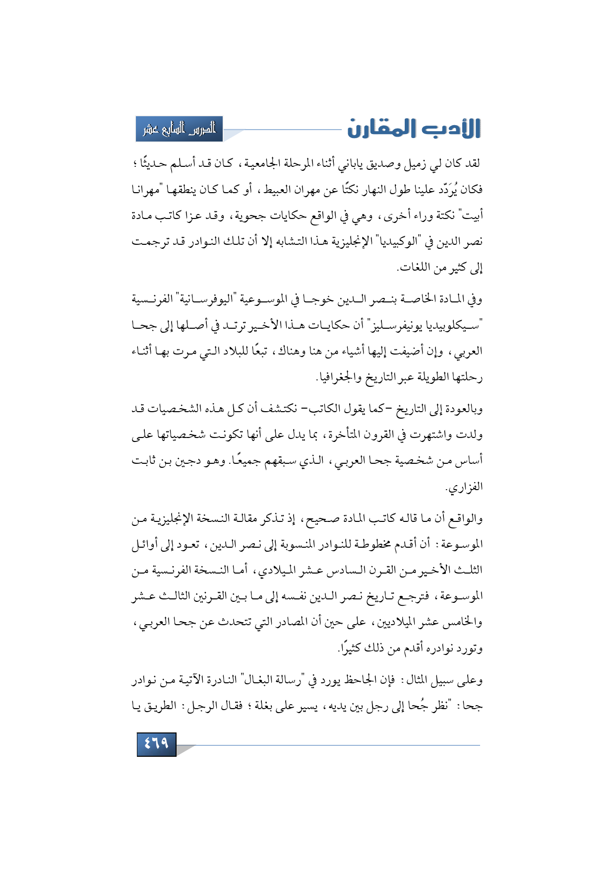 والواقع أن ما قاله كاتب المادة صحيح، إذ تذكر مقالة النسخة الإنجليزية من الموسوعة: أن أقدم مخطوطة للنوادر المنسوبة إلى نصر الدين تعود إلى أوائل الثلث الأخير من القرن السادس عشر الميلادي، أما النسخة الفرنسية من الموسوعة؛ فترجع تاريخ نصر الدين نفسه إلى ما بين القرنين الثالث عشر والخامس عشر الميلاديين، على حين أن المصادر التي تتحدث عن جحا العربي، وتورد نوادره أقدم من ذلك كثيرًا.