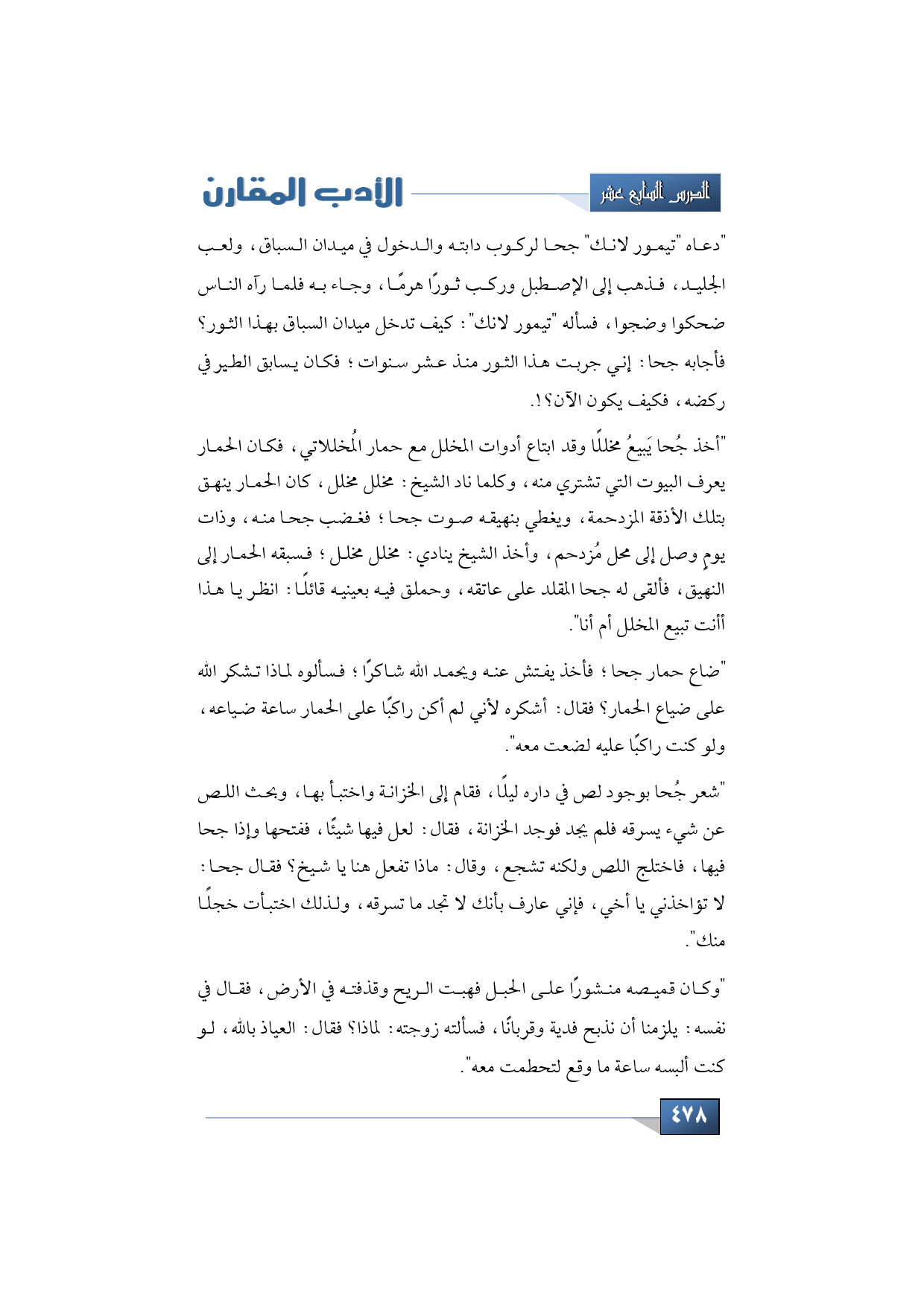 "دعاه "تيمور لانك" لركوب دابته والدخول في ميدان السباق، ولعب الجليد، فذهب إلى الإصطبل وركب ثورًا هرمًا، وجاء به فلما رآه الناس ضحكوا وضجوا، فسأله "تيمور لانك": كيف تدخل ميدان السباق بهذا الثور؟ فأجابه جحا: إني جربت هذا الثور منذ عشر سنوات؛ فكان يسابق الطير في ركضه، فكيف يكون الآن؟!.