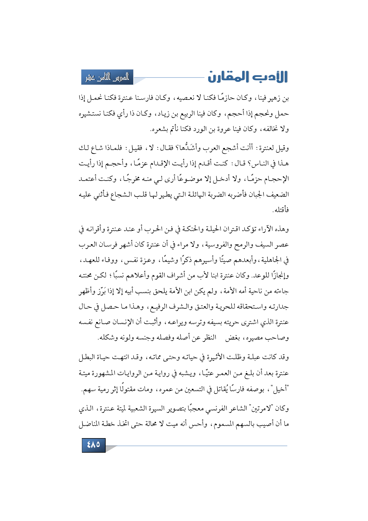 وكان "لامرتين" الشاعر الفرنسي معجبًا بتصوير السيرة الشعبية لميتة عنترة، الذي ما أن أصيب بالسهم المسموم، وأحس أنه ميت لا محالة حتى اتخذ خطة المناضل