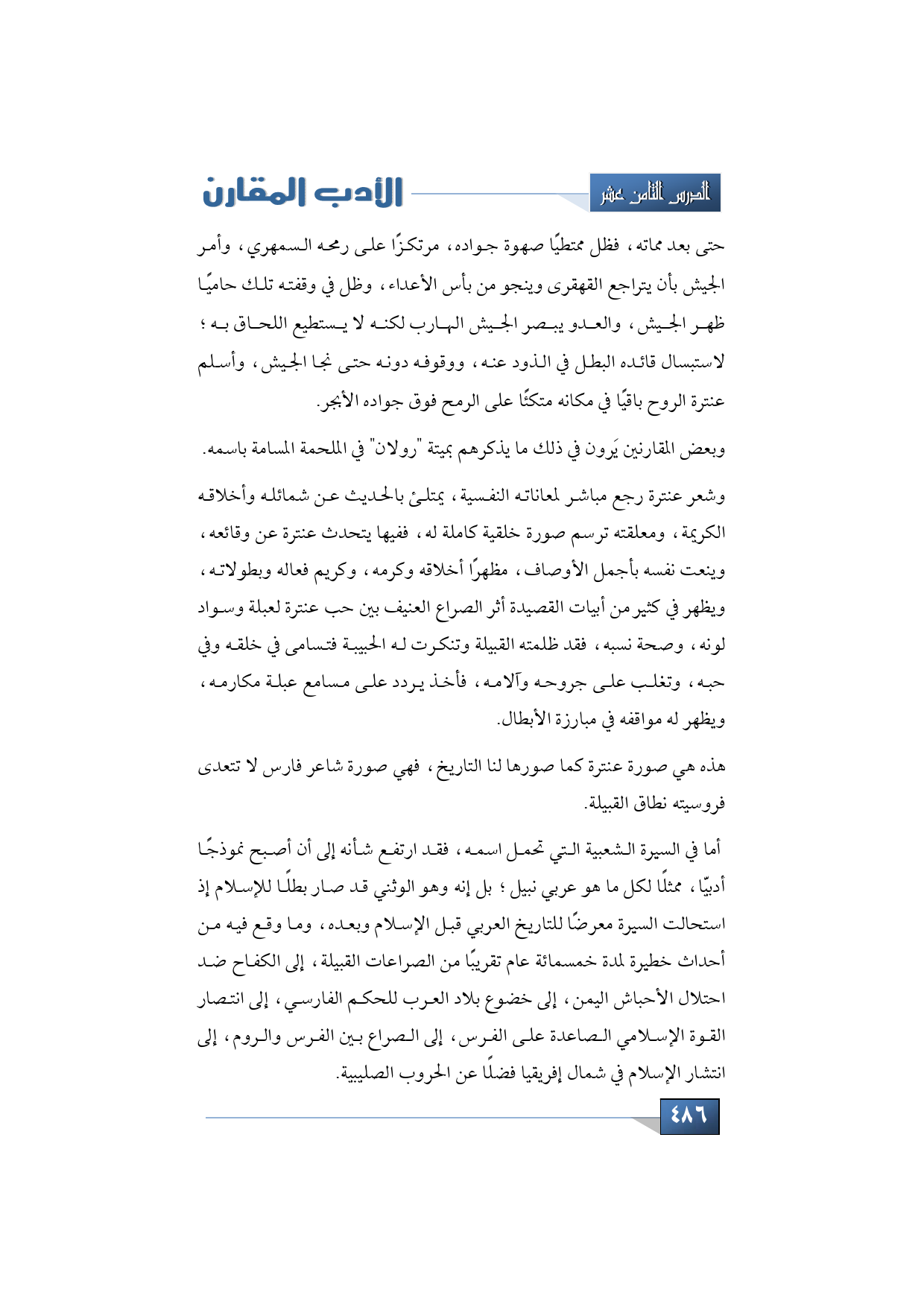 هذه هي صورة عنترة كما صورها لنا التاريخ، فهي صورة شاعر فارس لا تتعدى فروسيته نطاق القبيلة، أما في السيرة الشعبية التي تحمل اسمه، فقد ارتفع شأنه إلى أن أصبح نموذجًا أدبيّا، ممثلًا لكل ما هو عربي نبيل؛ بل إنه وهو الوثني قد صار بطلًا للإسلام إذ استحالت السيرة معرضًا للتاريخ العربي قبل الإسلام وبعده، وما وقع فيه من أحداث خطيرة لمدة خمسمائة عام تقريبًا من الصراعات القبيلة، إلى الكفاح ضد احتلال الأحباش اليمن، إلى خضوع بلاد العرب للحكم الفارسي، إلى انتصار القوة الإسلامي الصاعدة على الفرس، إلى الصراع بين الفرس والروم، إلى انتشار الإسلام في شمال إفريقيا فضلًا عن الحروب الصليبية.