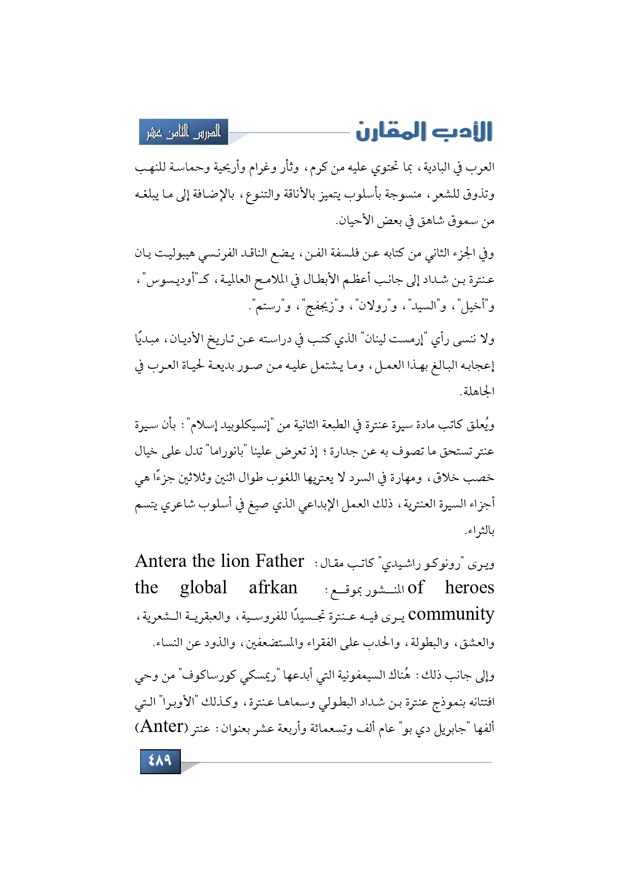 وفي الجزء الثاني من كتابه عن فلسفة الفن، يضع الناقد الفرنسي هيبوليت بِان عنترة بن شداد إلى جانب أعظم الأبطال في الملامح العالمية، كـ"أوديسوس"، و"أخيل"، و"السيد"، و"رولان"، و"زيجفج"، و"رستم"، ولا ننسى رأي "إرمست لينان" الذي كتب في دراسته عن تاريخ الأديان، مبديًا إعجابه البالغ بهذا العمل، وما يشتمل عليه من صور بديعة لحياة العرب في الجاهلة.