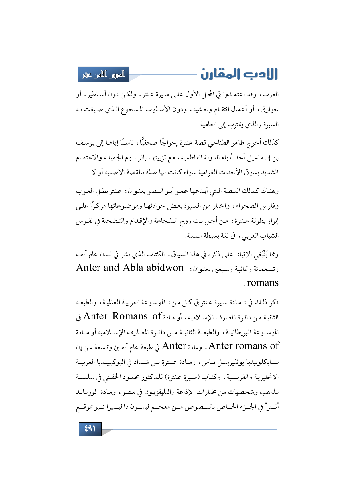 ومما يَنْبَغي الإتيان على ذكره في هذا السياق الكتاب الذي نشر في لندن عام ألف وتسعمائة وثمانية وسبعين بعنوان: Anter and Abla abidwon romans