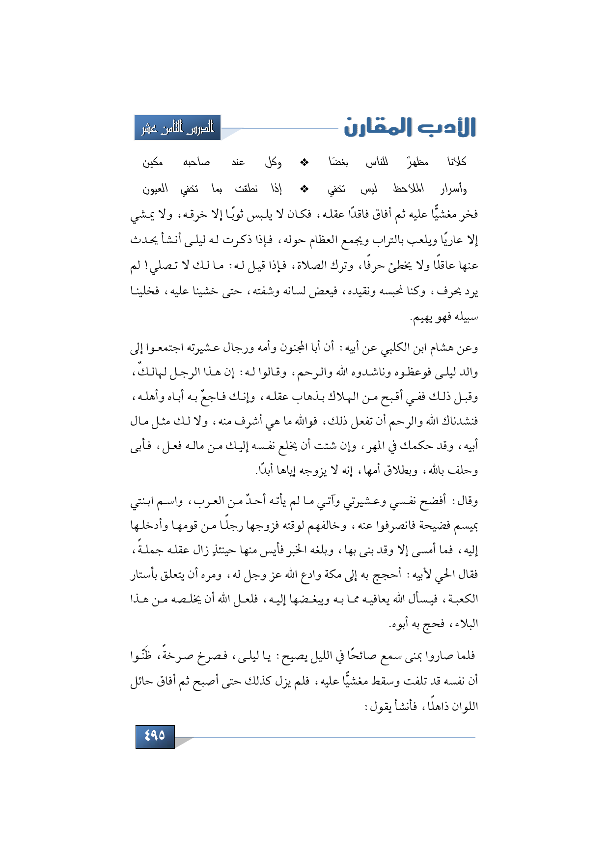 وقال: أفضح نفسي وعشيرتي وآتي ما لم يأته أحدٌ من العرب، واسم ابنتي بميسم فضيحة فانصرفوا عنه، وخالفهم لوقته فزوجها رجلًا من قومها وأدخلها إليه، فما أمسى إلا وقد بنى بها، وبلغه الخبر فأيس منها حينئذٍ وزال عقله جملةً، فقال الحي لأبيه: أحجج به إلى مكة وادع الله عز وجل له، ومره أن يتعلق بأستار الكعبة، فيسأل الله يعافيه مما به ويبغضها إليه، فلعل الله أن يخلصه من هذا البلاء، فحج به أبوه.