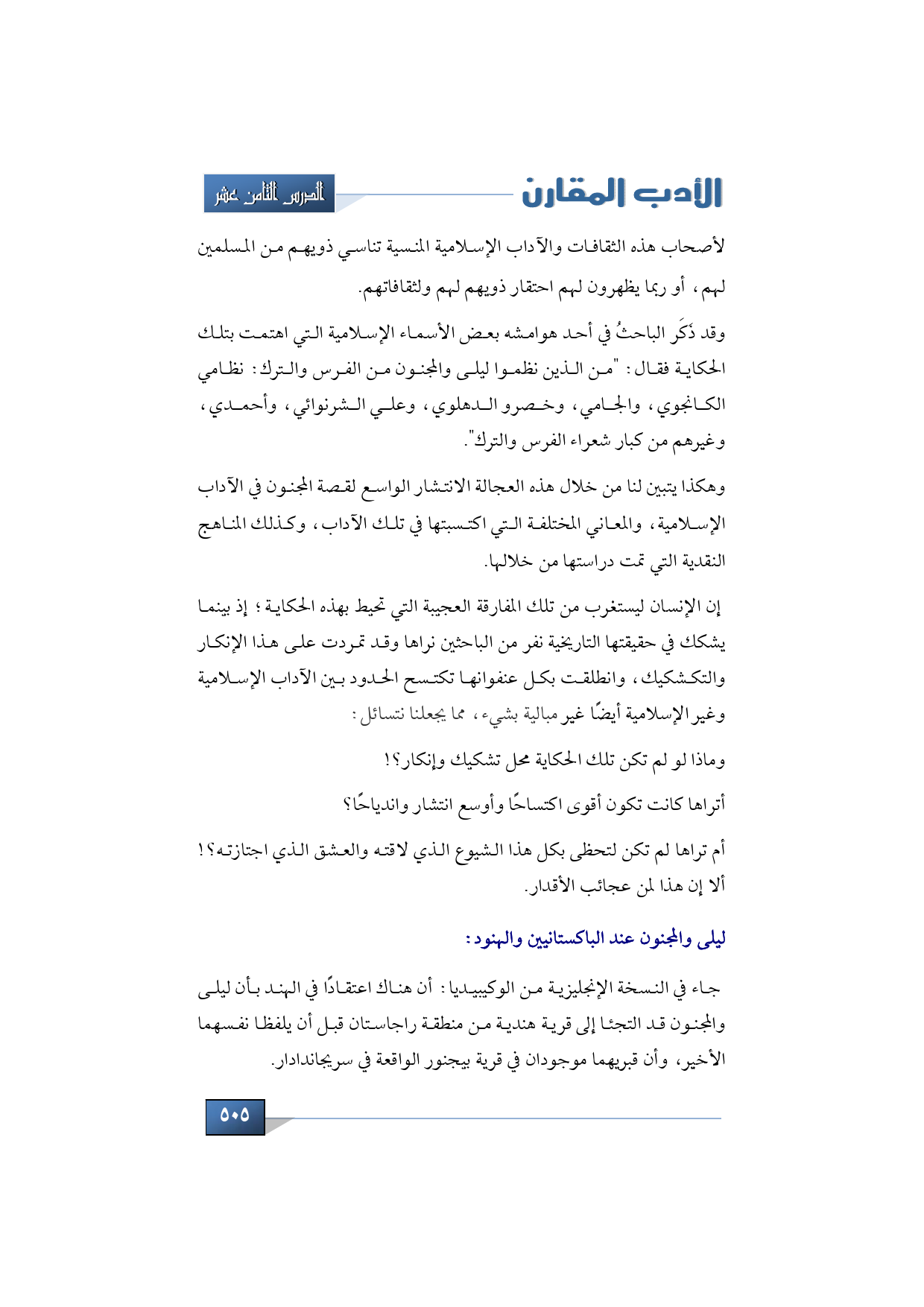 وقد ذَكَر الباحثُ في أحد هوامشه بعض الأسماء الإسلامية التي اهتمت بتلك الحكاية فقال: "من الذين نظموا ليلى والمجنون من الفرس والترك: نظامي الكانجوي، والجامي، وخصرو الدهلوي، وعلي الشرنوائي، وأحمدي، وغيرهم من كبار شعراء الفرس والترك".