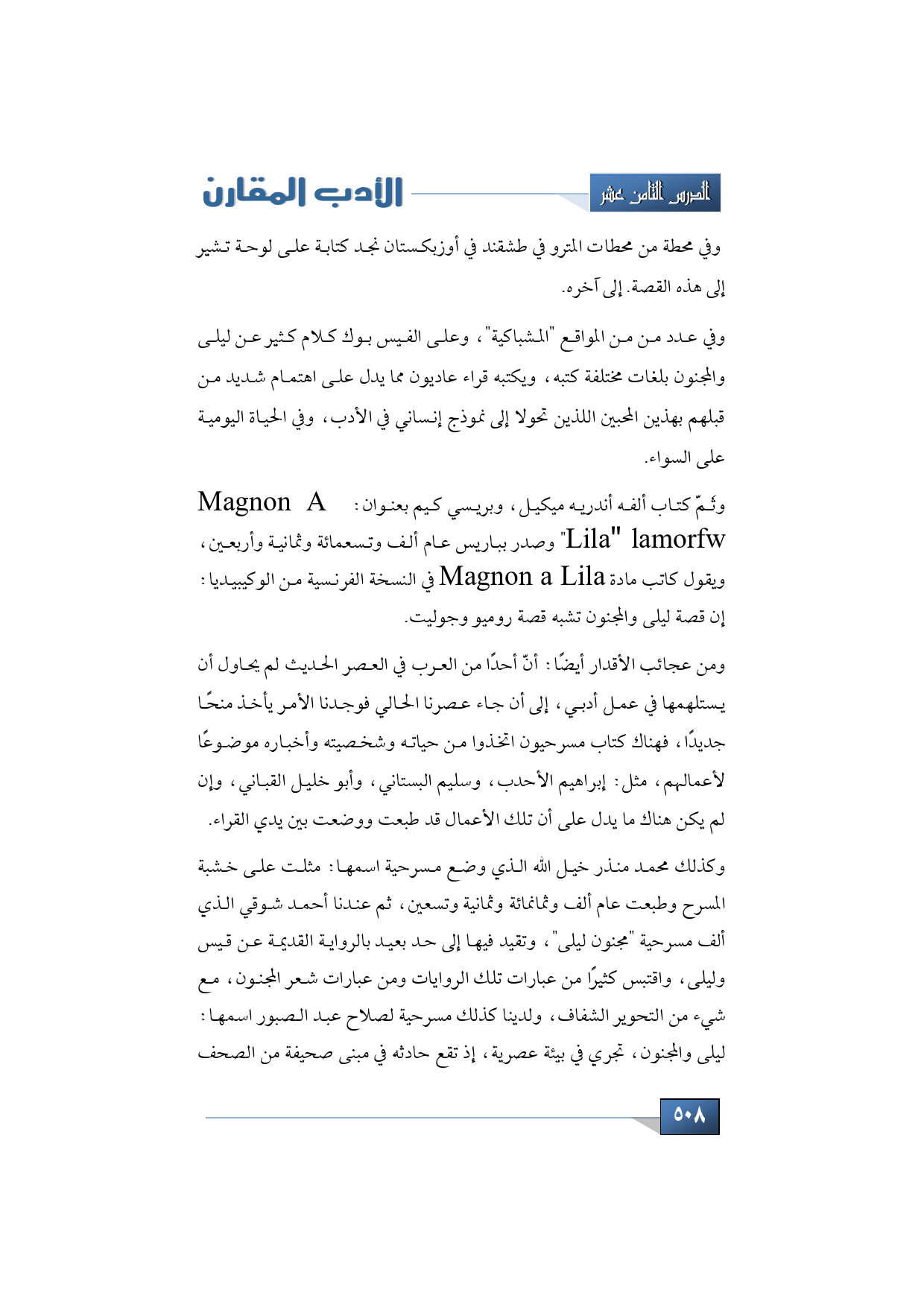 وثَمّ كتاب ألفه أندريه ميكيل، وبريسي كيم بعنوان: Magnon A Lila " lamorfw " وصدر بباريس عام ألف وتسعمائة وثمانية وأربعين، ويقول كاتب مادة: Magnon a Lila في النسخة الفرنسية من الوكيبيديا إن قصة ليلى والمجنون تشبه قصة روميو وجوليت.