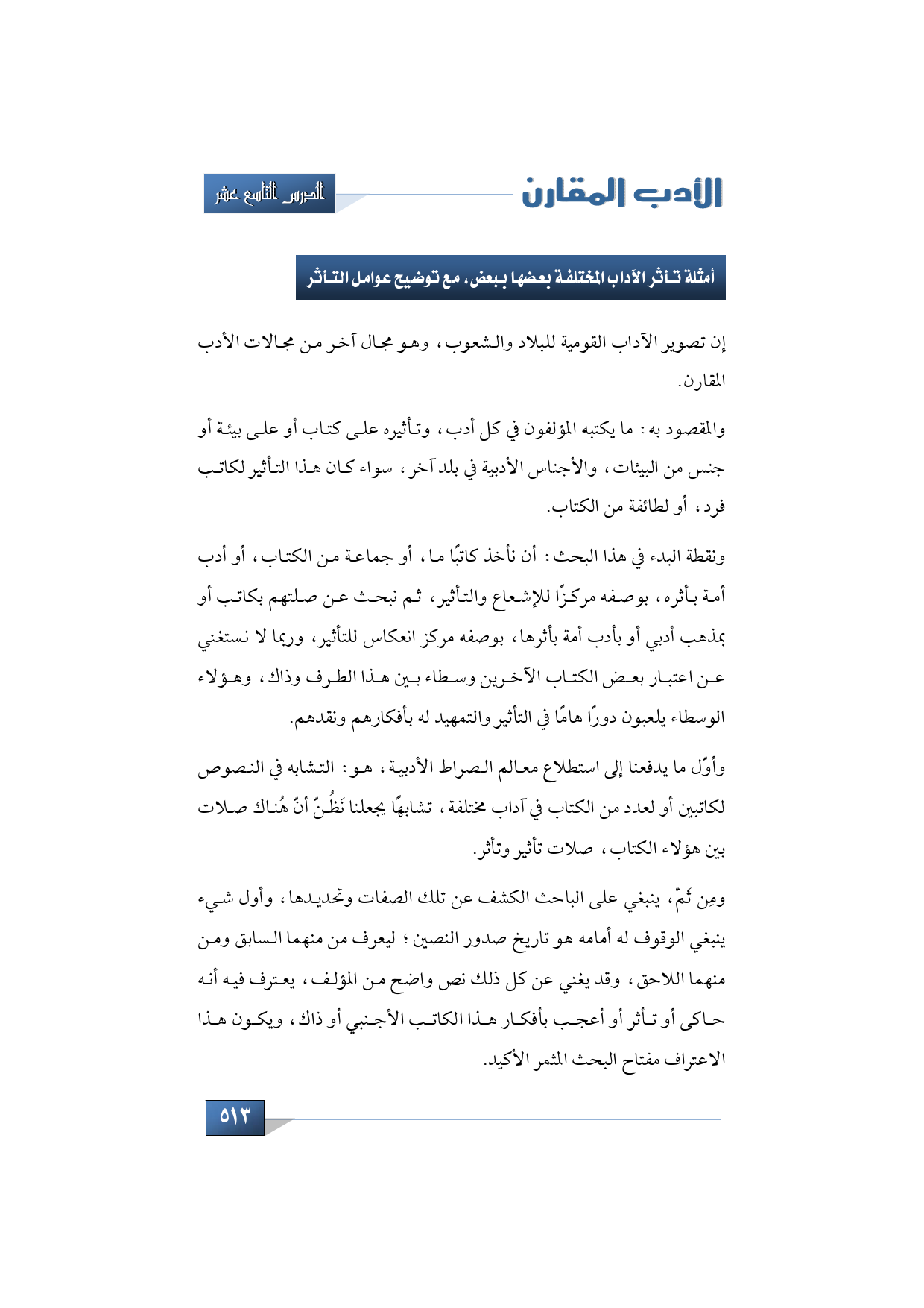 ونقطة البدء في هذا البحث: أن نأخذ كاتبًا ما، أو جماعة من الكتاب، أو أدب أمة بأثره، بوصفه مركزًا للإشعاع والتأثير ثم نبحث عن صلتهم بكاتب أو بمذهب أدبي أو بأدب أمة بأثرها بوصفه مركز انعكاس للتأثير، وربما لا نستغني عن اعتبار بعض الكتاب الآخرين وسطاء بين هذا الطرف وذاك، وهؤلاء الوسطاء يلعبون دورًا هامًا في التأثير والتمهيد له بأفكارهم ونقدهم.