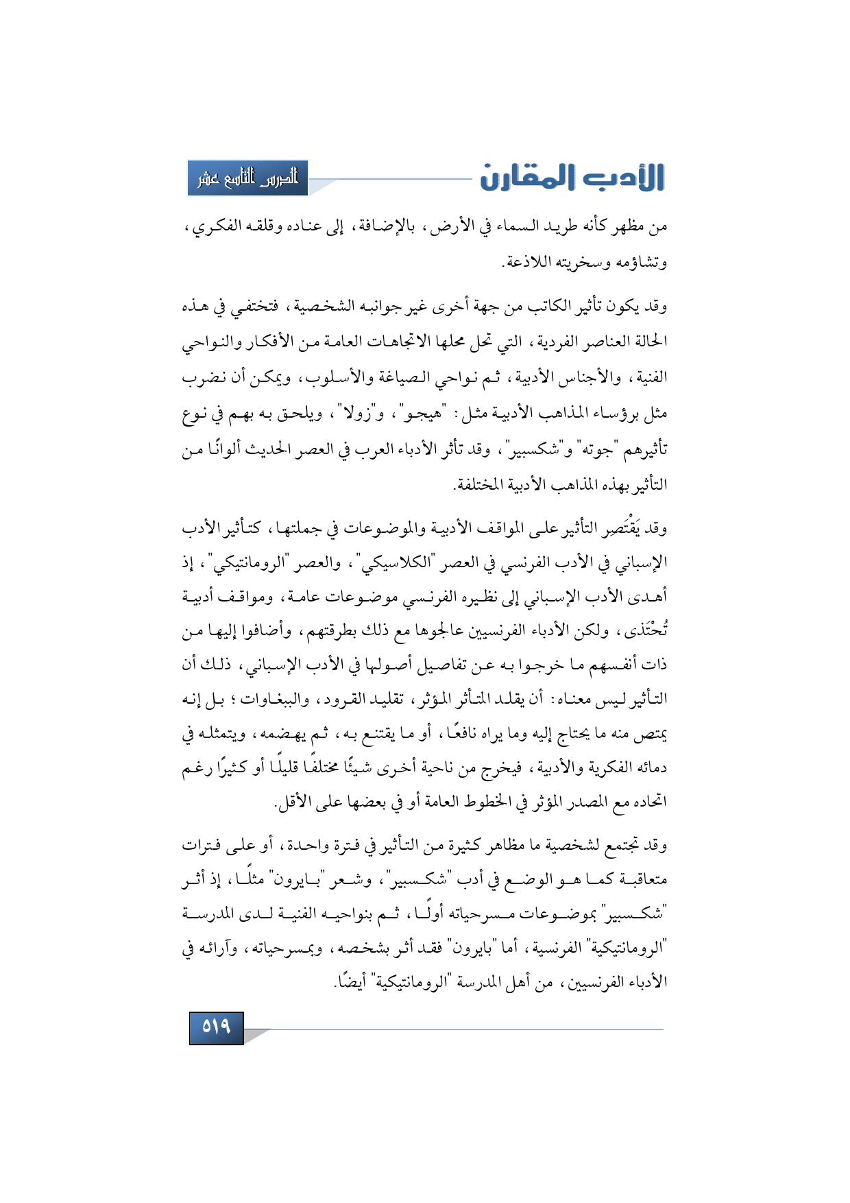 وقد يكون تأثير الكاتب من جهة أخرى غير جوانبه الشخصية، فتختفي في هذه الحالة العناصر الفردية، التي تحل محلها الاتجاهات العامة من الأفكار والنواحي الفنية، والأجناس الأدبية، ثم نواحي الصياغة والأسلوب، ويمكن أن نضرب مثل برؤساء المذاهب الأدبية مثل: "هيجو"، و"زولا"، ويلحق به بهم في نوع تأثيرهم "جوته" و"شكسبير"، وقد تأثر الأدباء العرب في العصر الحديث ألوانًا من التأثير بهذه المذاهب الأدبية المختلفة.