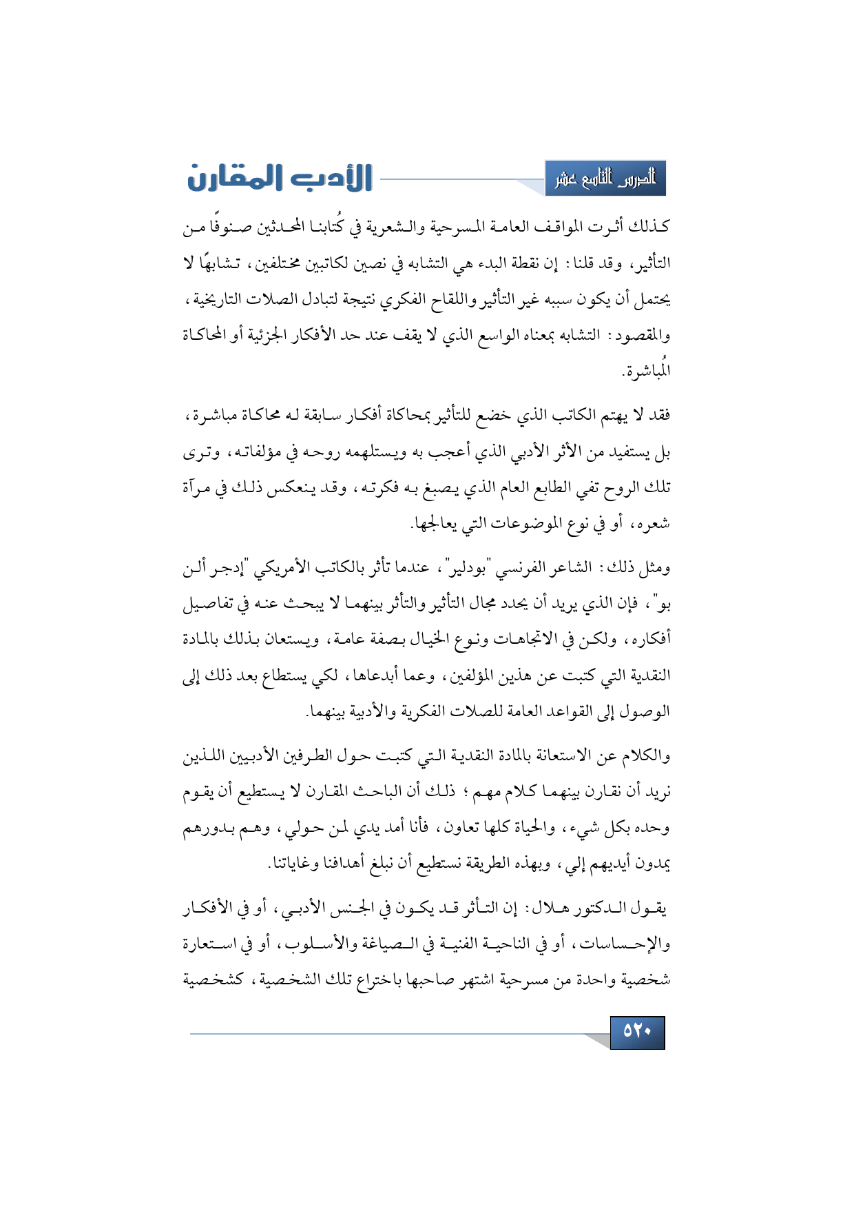 ومثل ذلك الشاعر الفرنسي "بودلير"، عندما تأثر بالكاتب الأمريكي "إدجر ألن بو" فإن الذي يريد أن يحدد مجال التأثير والتأثر بينهما لا يبحث عنه في تفاصيل أفكار، ولكن في الاتجاهات ونوع الخيال بصفة عامة، ويستعان بذلك بالمادة النقدية التي كتبت عن هذين المؤلفين، وعما أبدعاها، لكي يستطاع بعد ذلك إلى الوصول إلى القواعد العامة للصلات الفكرية والأدبية بينهما.