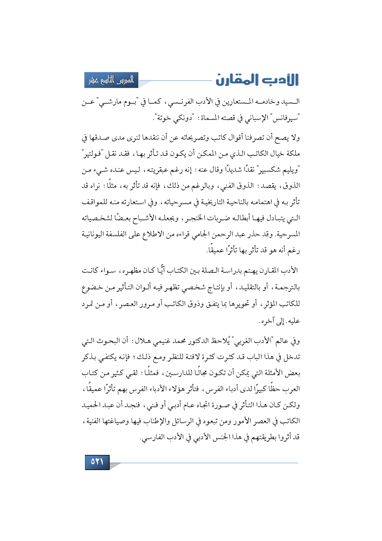 إذًا فالأدب المقارن يهتم بدراسة الصلة بين الكتاب أيًّا كان مظهرها، سواء كانت بالترجمة، أو بالتقليد، أو بإنتاج شخصي تظهر فيه ألوان التأثير من خضوع للكاتب المؤثر، أو تحويرها بما يتفق وذوق الكاتب أو مرور العصر، أو من تمرد عليه ... إلى آخره.