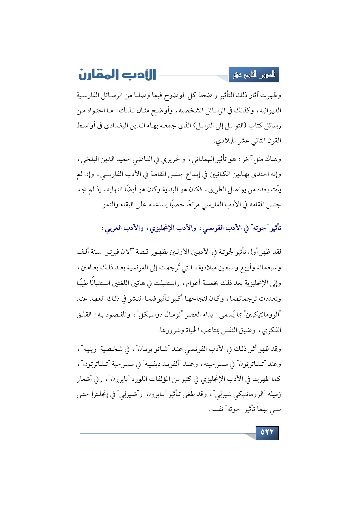 وعندنا أيضًا تأثير "جوته" في الأدب الفرنسي والأدب الإنجليزي والأدب العربي، وقد ظهر أول تأثير لجوتة في الأدبين الأولين بظهور قصة "آلان فيرتر" سنة ألف وسبعمائة وأربع وسبعين ميلادية، التي تُرجمت إلى الفرنسية بعد ذلك بعامين، وإلى الإنجليزية بعد ذلك بخمسة أعوام، واستقبلت في هاتين اللغتين استقبالًا طيبًا وتعددت ترجماتهما، وكان لنجاحها أكبر تأثير فيما انتشر في ذلك العهد عند "الرومانتيكيين" بما يُسمى بداء العصر "لومال دوسيكل"، والمقصود به القلق الفكري وضيق النفس بمتاعب الحياة وشرورها.