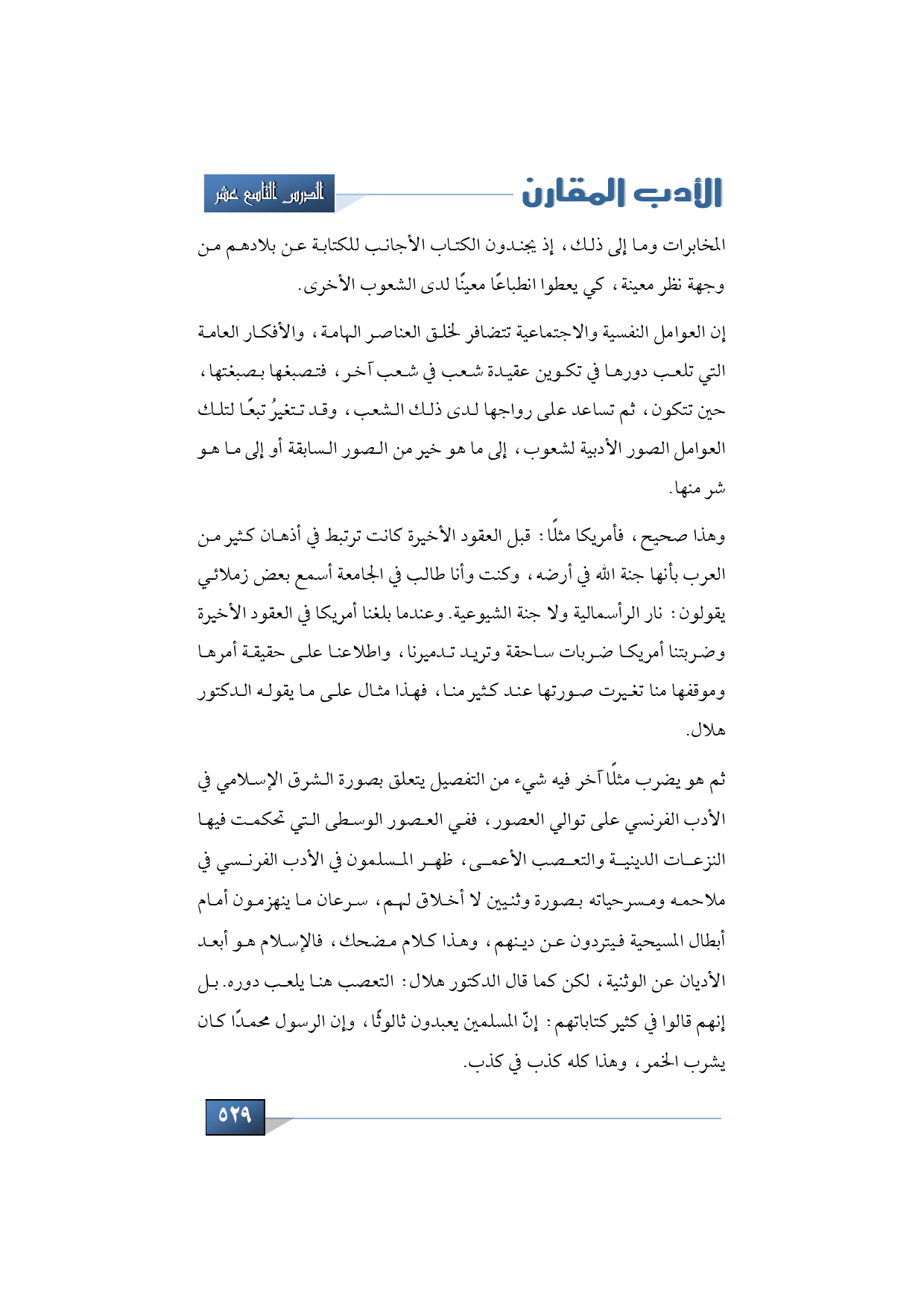 ثم هو يضرب مثلًا آخر فيه شيء من التفصيل يتعلق بصورة الشرق الإسلامي في الأدب الفرنسي على توالي العصور، ففي العصور الوسطى التي تحكمت فيها النزعات الدينية والتعصب الأعمى، ظهر المسلمون في الأدب الفرنسي في ملاحمه ومسرحياته بصورة وثنيين لا أخلاق لهم، سرعان ما ينهزمون أمام أبطال المسيحية فيتردون عن دينهم، وهذا طبعًا كلام مضحك، فالإسلام هو أبعد الأديان عن الوثنية، لكن كما قال الدكتور هلال: التعصب هنا يلعب دوره. بل إنهم قالوا في كثير كتاباتهم: إنّ المسلمين يعبدون ثالوثًا، وإن الرسول محمدًا كان يشرب الخمر، وهذا كله كذب في كذب.