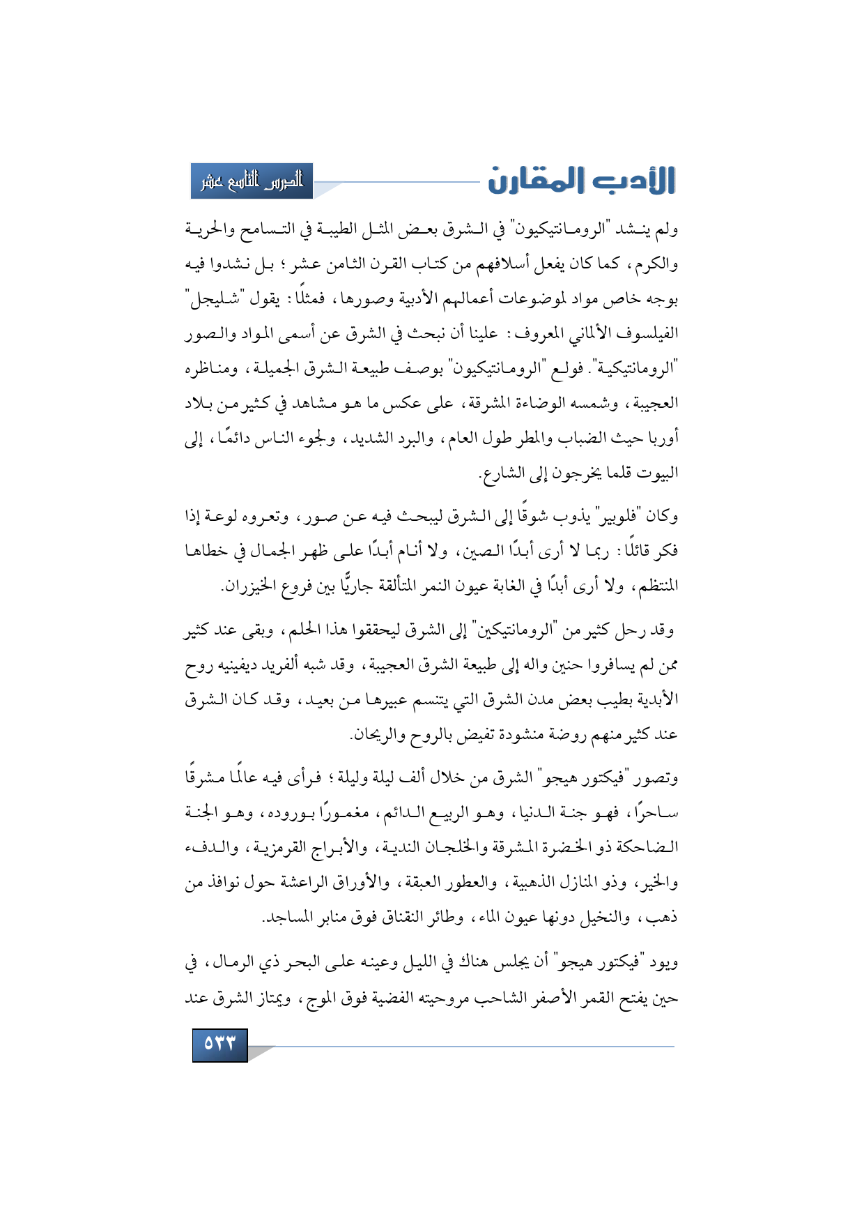 ولم ينشد "الرومانتيكيون" في الشرق بعض المثل الطيبة في التسامح والحرية والكرم، كما كان يفعل أسلافهم من كتاب القرن الثامن عشر؛ بل نشدوا فيه بوجه خاص مواد لموضوعات أعمالهم الأدبية وصورها، فمثلًا يقول "شليجل" الفيلسوف الألماني المعروف: علينا أن نبحث في الشرق عن أسمى المواد والصور "الرومانتيكية". فولع "الرومانتيكيون" بوصف طبيعة الشرق الجميلة، ومناظره العجيبة، وشمسه الوضاءة المشرقة، على عكس ما هو مشاهد في كثير من بلاد أوربا حيث الضباب والمطر طول العام، والبرد الشديد، وهكذا ولجوء الناس دائمًا، إلى البيوت قلما يخرجون إلى الشارع.