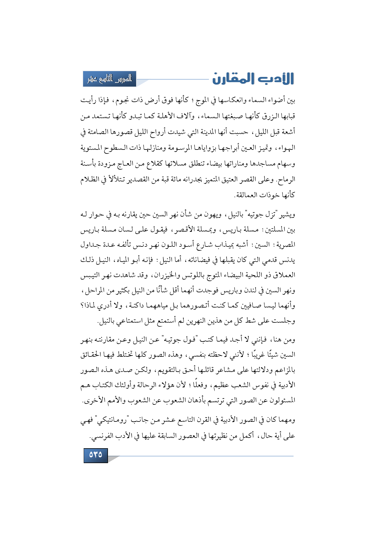 ومن هنا فإنني لا أجد فيما كتب "فول جوتيه" عن النيل وعن مقارنته بنهر السين شيئًا غريبًا؛ لأنني لاحظته بنفسي، وهذه الصور كلها تختلط فيها الحقائق بالمزاعم ودلالتها على مشاعر قائلها أحق بالتقويم، ولكن صدى هذه الصور الأدبي في نفوس الشعب عظيم، وفعلًا؛ لأن هؤلاء الرحالة وألئك الكتاب هم مسئولون عن الصور التي ترتسم بأذهان الشعوب عن الشعوب والأمم الأخرى.