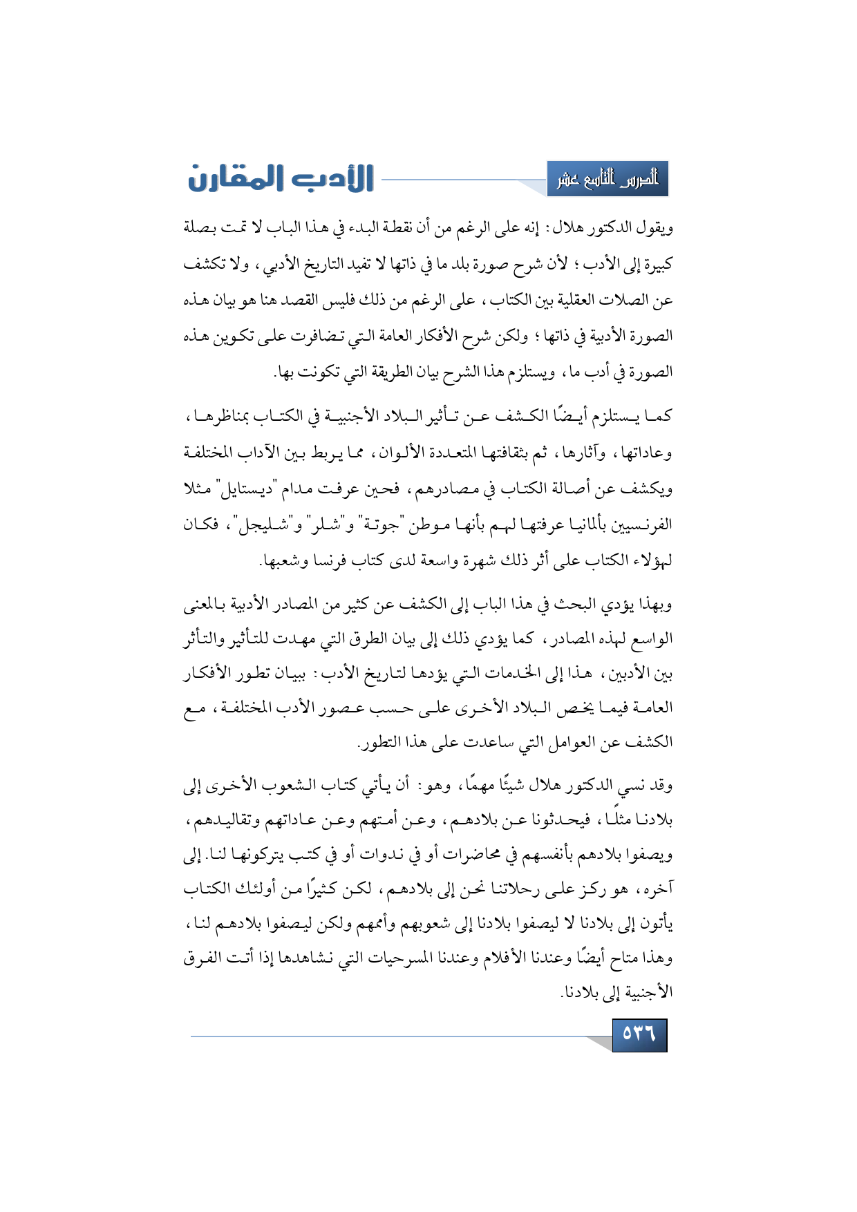 ويقول الدكتور هلال: إنه على الرغم من أن نقطة البدء في هذا الباب لا تمت بصلة كبيرة إلى الأدب؛ لأن شرح صورة بلد ما في ذاتها لا تفيد التاريخ الأدبي، ولا تكشف عن الصلات العقلية بين الكتاب، على الرغم من ذلك فليس القصد هنا هو بيان هذه الصورة الأدبية في ذاتها؛ ولكن شرح الأفكار العامة التي تضافرت على تكوين هذه الصورة في أدب ما، ويستلزم هذا الشرح بيان الطريقة التي تكونت بها.