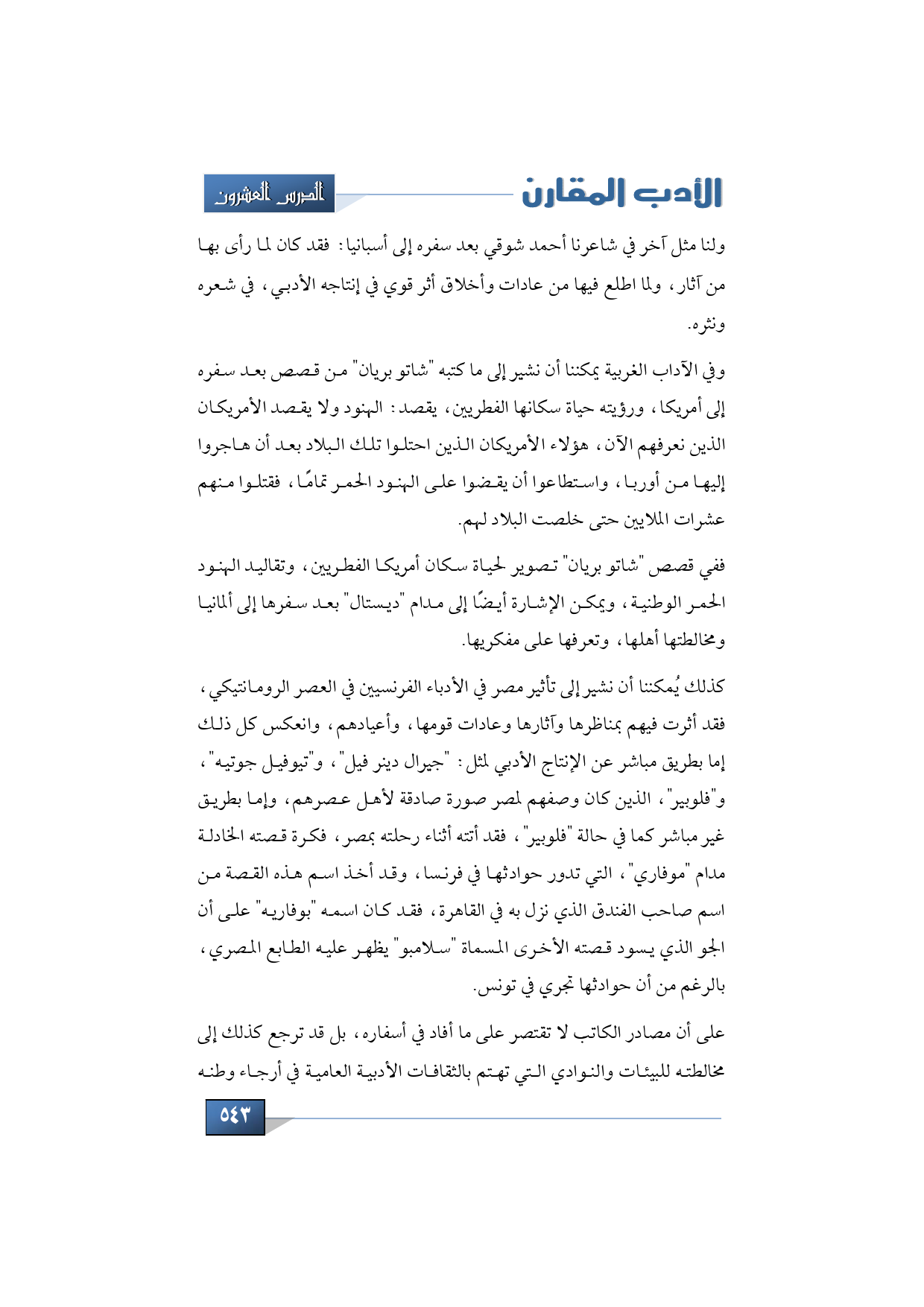 كذلك يُمكننا أن نشير إلى تأثير مصر في الأدباء الفرنسيين في العصر الرومانتيكي، فقد أثرت فيهم بمناظرها وآثارها وبعادات قومها، وأعيادهم، وانعكس كل ذلك إما بطريق مباشر عن الإنتاج الأدبي لمثل "جيرال دينر فيل"، و"تيوفيل جوتيه"، و"فلوبير"، الذين كان وصفهم لمصر صورة صادقة لأهل عصرهم، وإما بطريق غير مباشر كما في حالة "فلوبير"، فقد أتته أثناء رحلته بمصر، فكرة قصته الخادلة مدام "موفاري"، التي تدور حوادثها في فرنسا، وقد أخذ اسم هذه القصة من اسم صاحب الفندق الذي نزل به في القاهرة فقد كان اسمه "بوفاريه" على أن الجو الذي يسود قصته الأخرى المسماة "سلامبو" يظهر عليه الطابع المصري بالرغم من أن حوادثها تجري في تونس.