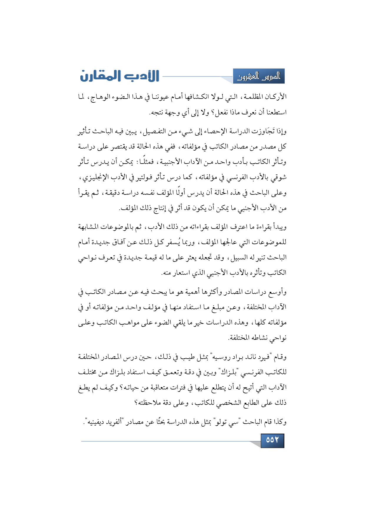وقام "فيرد ناند براد روسيه" بمثلًا طيب في ذلك حين درس المصادر المختلفة للكاتب الفرنسي "بلزاك" وبين في دقة وتعمق كيف استفاد بلزاك من مختلف الآداب التي أتيح له أن يتطلع عليها في فترات متعاقبة من حياته؟ وكيف لم يطغ ذلك على الطابع الشخصي للكاتب، وعلى دقة ملاحظته؟
