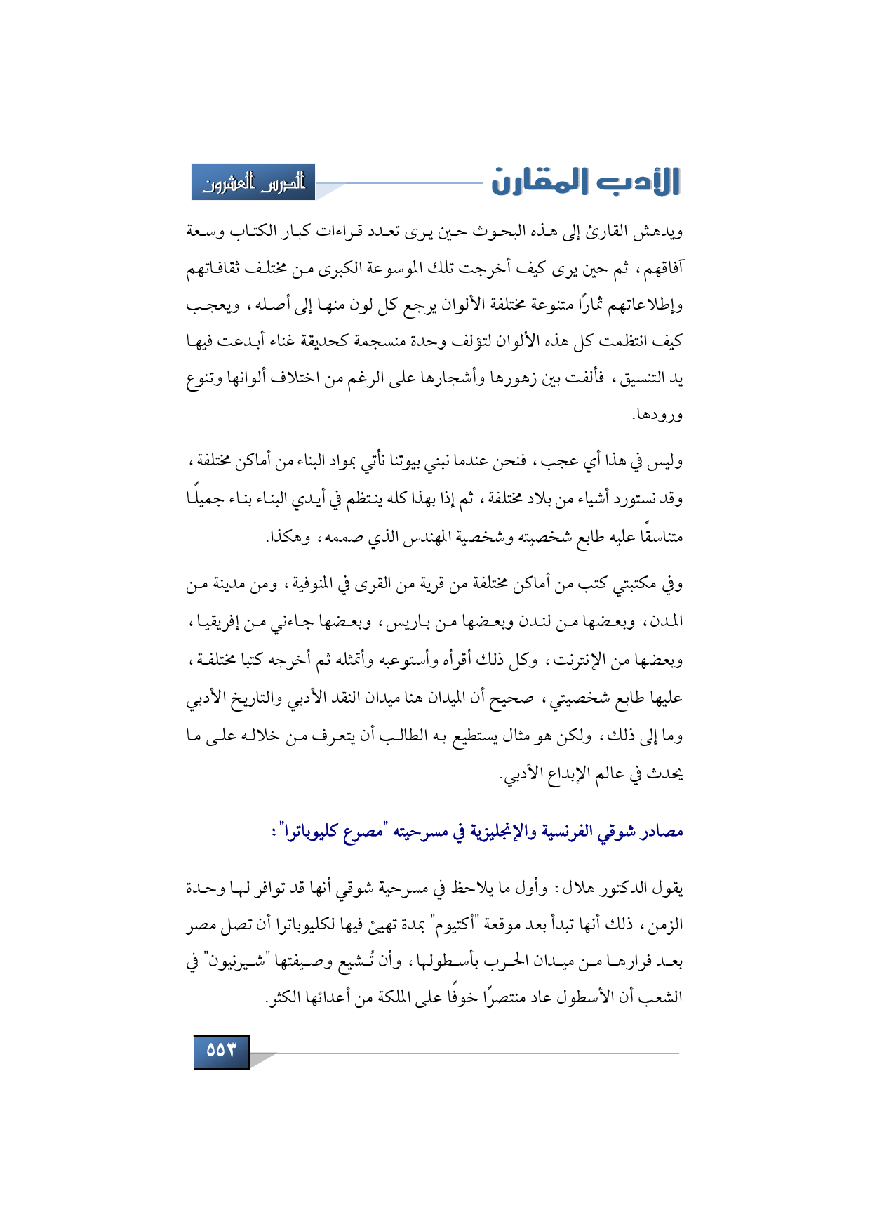 يضرب الدكتور هلال مثلًا فيه شيئًا من التفصيل فيما يختص بمصادر شوقي الفرنسية والإنجليزية في مسرحيته "مصرع كليوباترا"، وأول ما يلاحظه في مسرحية شوقي أنها قد توافر لها وحدة الزمن، ذلك أنها تبدأ بعد موقعة "أكتيوم" بمدة تهيئ فيها لكليوباترا أن تصل مصر بعد فرارها من ميدان الحرب بأسطولها، وأن تُشيع وصيفتها "شيرنيون" في الشعب أن الأسطول عاد منتصرًا خوفًا على الملكة من أعدائها الكثر.