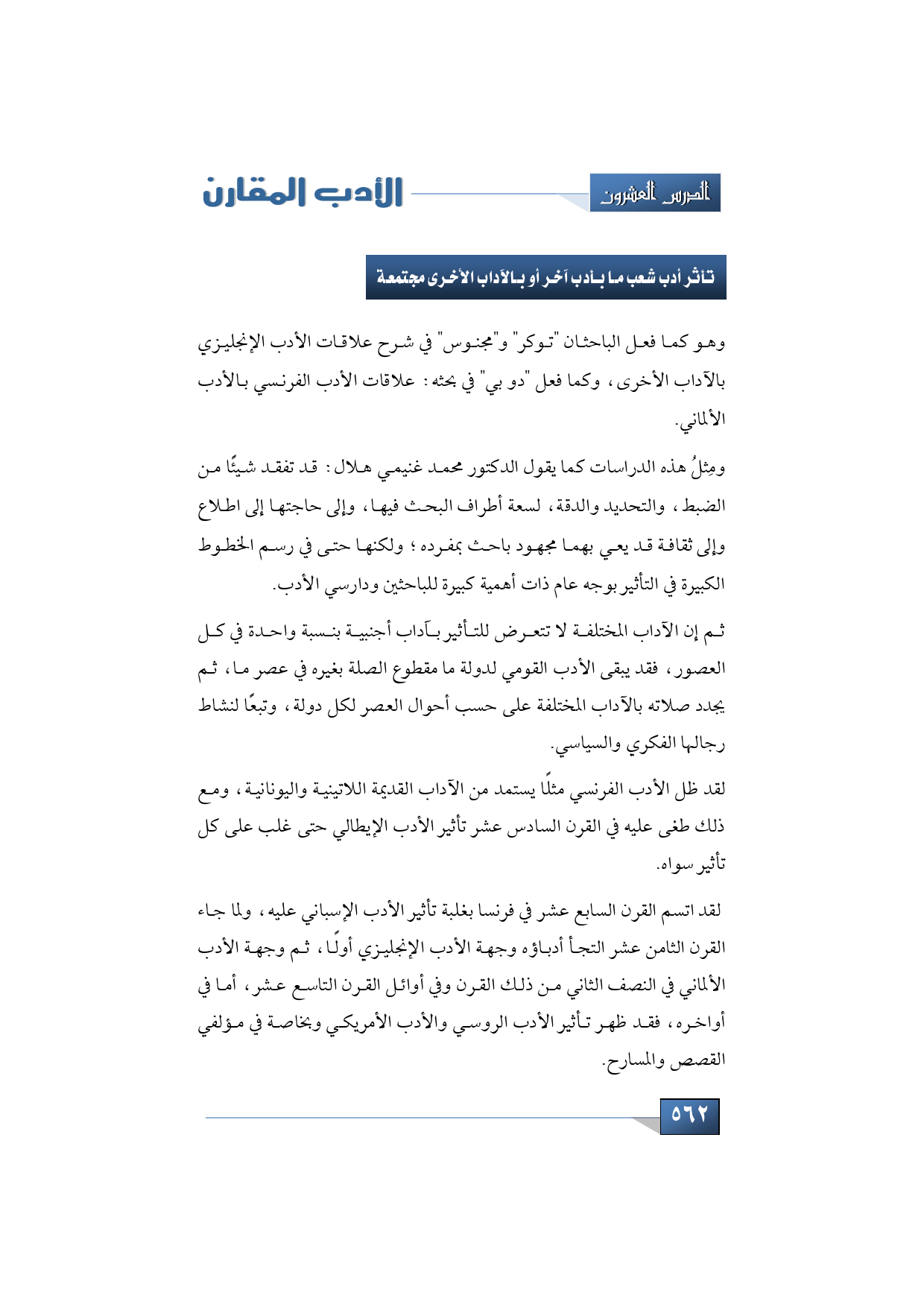 ومِثلُ هذه الدراسات كما يقول الدكتور محمد غنيمي هلال: قد تفقد شيئًا من الضبط، والتحديد والدقة، لسعة أطراف البحث فيها، وإلى حاجتها إلى اطلاع وإلى ثقافة قد يعي بهما مجهود باحث بمفرده؛ ولكنها حتى في رسم الخطوط الكبيرة في التأثير بوجه عام ذات أهمية كبيرة للباحثين ودارسي الأدب.