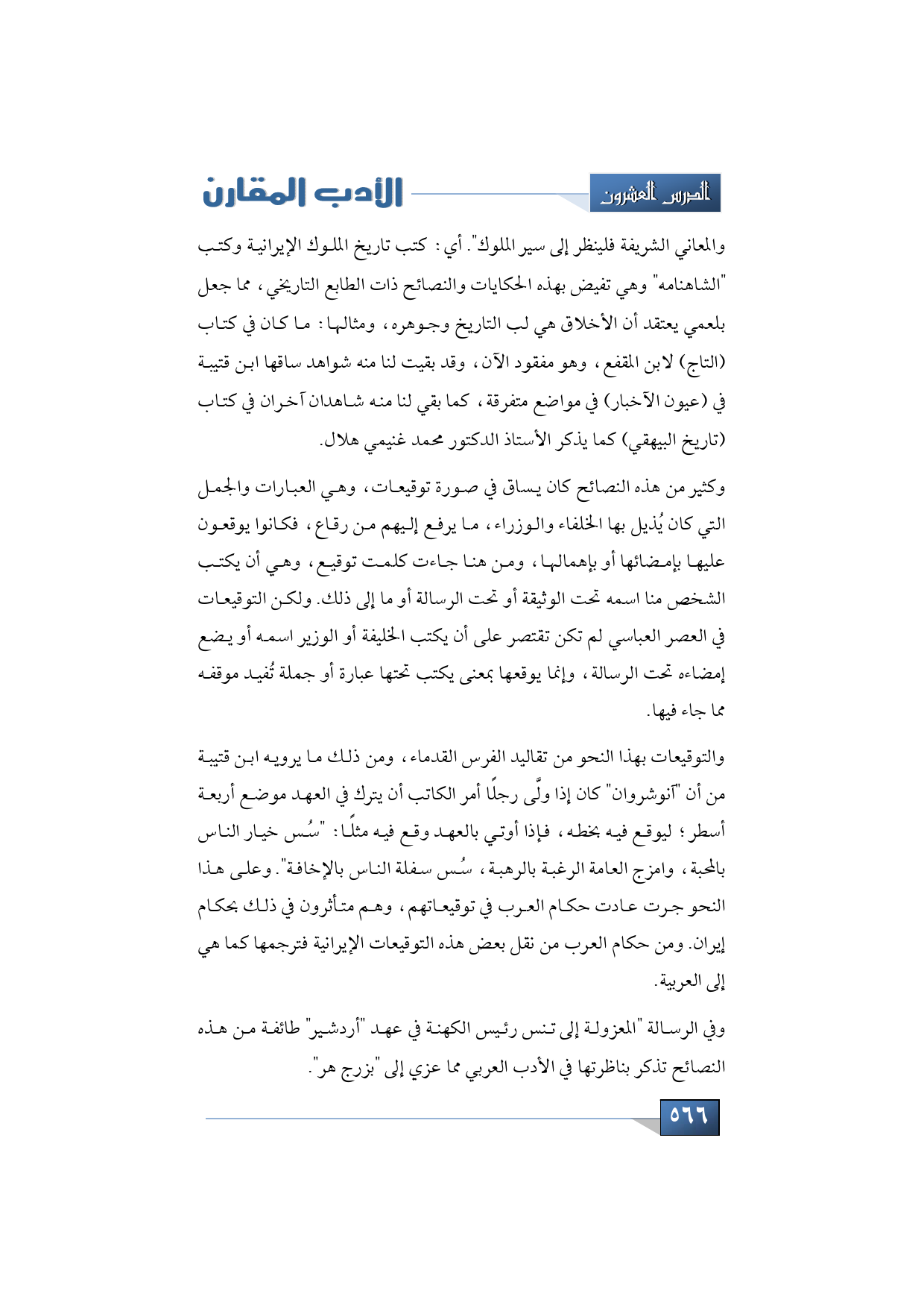 والمعاني الشريفة فلينظر إلى سير الملوك". أي كتب تاريخ الملوك الإيرانية وكتب "الشاهنامه" وهي تفيض بهذه الحكايات والنصائح ذات الطابع التاريخي، مما جعل بلعمي يعتقد أن الأخلاق هي لب التاريخ وجوهره، ومثالها ما كان في كتاب (التاج) لابن المقفع، وهو مفقود الآن، وقد بقيت لنا منه شواهد ساقها ابن قتيبة في عيون الآخبار في مواضع متفرقة كما بقي لنا منه شاهدان آخران في كتاب (تاريخ البيهقي) كما يذكر الأستاذ الدكتور محمد غنيمي هلال.