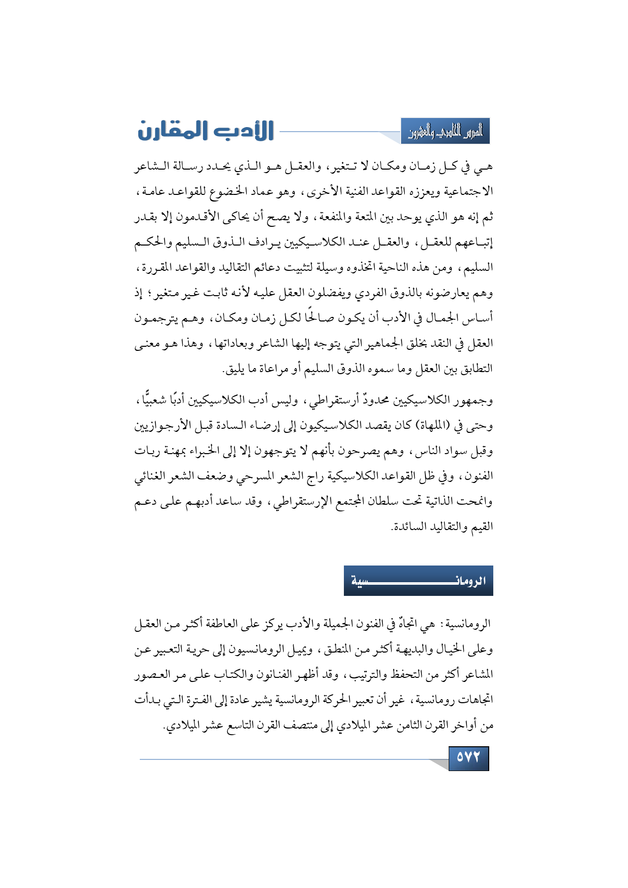 هي في كل زمان ومكان لا تتغير، والعقل هو الذي يحدد رسالة الشاعر الاجتماعية ويعززه القواعد الفنية الأخرى، وهو عماد الخضوع للقواعد عامة، ثم إنه هو الذي يوحد بين المتعة والمنفعة، ولا يصح أن يحاكى الأقدمون إلا بقدر إتباعهم للعقل، والعقل عند الكلاسيكيين يرادف الذوق السليم والحكم السليم، ومن هذه الناحية اتخذوه وسيلة لتثبيت دعائم التقاليد والقواعد المقررة، وهم يعارضونه بالذوق الفردي ويفضلون العقل عليه لأنه ثابت غير متغير؛ إذ أساس الجمال في الأدب أن يكون صالحًا لكل زمان ومكان، وهم يترجمون العقل في النقد بخلق الجماهير التي يتوجه إليها الشاعر وبعاداتها، وهذا هو معنى التطابق بين العقل وما سموه الذوق السليم أو مراعاة ما يليق.