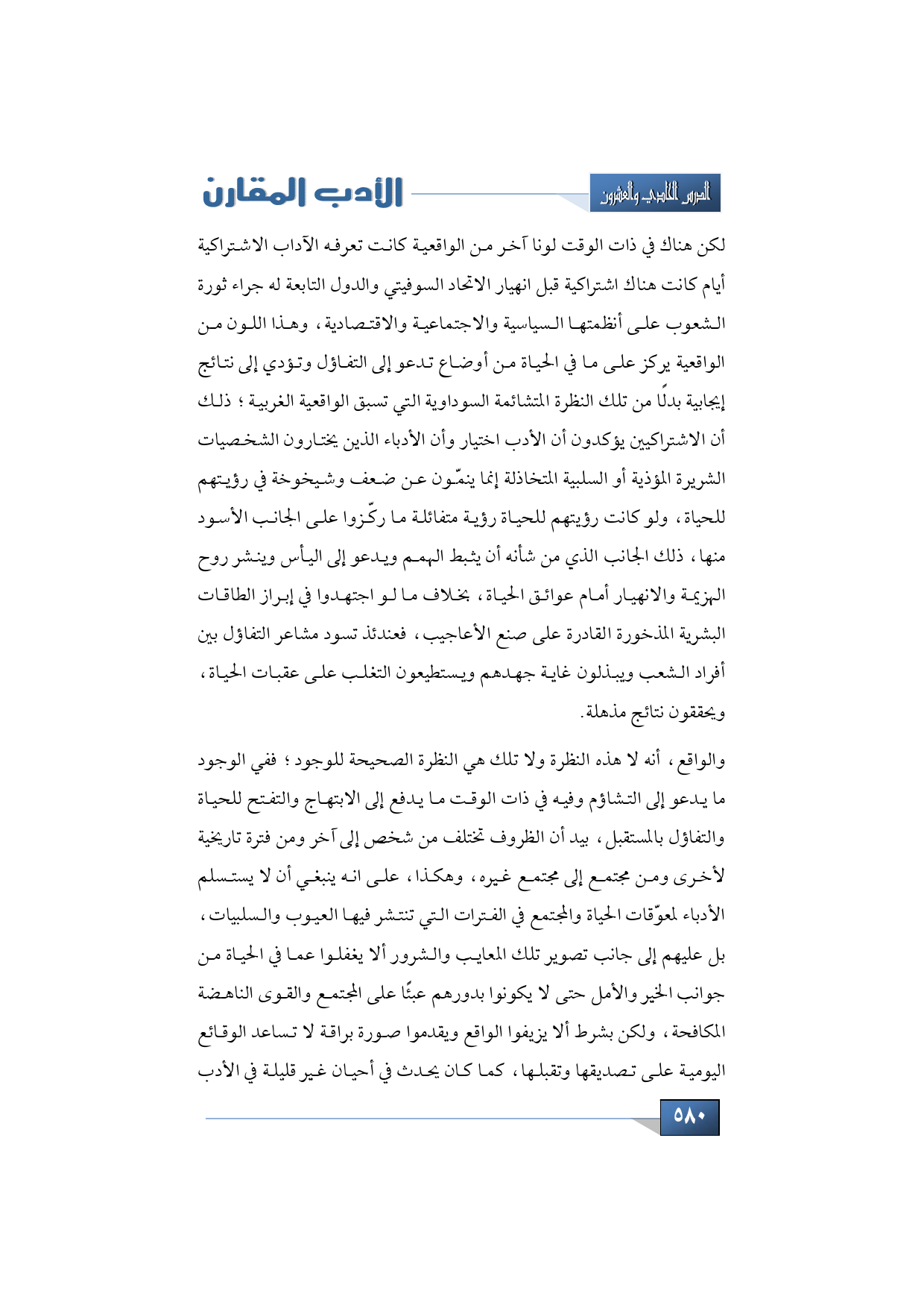والواقع، أنه لا هذه النظرة ولا تلك هي النظرة الصحيحة للوجود؛ ففي الوجود ما يدعو إلى التشاؤم وفيه في ذات الوقت ما يدفع إلى الابتهاج والتفتح للحياة والتفاؤل بالمستقبل، بيد أن الظروف تختلف من شخص إلى آخر ومن فترة تاريخية لأخرى ومن مجتمع إلى مجتمع غيره، وهكذا، على انه ينبغي أن لا يستسلم الأدباء لمعوّقات الحياة والمجتمع في الفترات التي تنتشر فيها العيوب والسلبيات، بل عليهم إلى جانب تصوير تلك المعايب والشرور ألا يغفلوا عما في الحياة من جوانب الخير والأمل حتى لا يكونوا بدورهم عبئًا على المجتمع والقوى الناهضة المكافحة، ولكن بشرط ألا يزيفوا الواقع ويقدموا صورة براقة لا تساعد الوقائع اليومية على تصديقها وتقبلها، كما كان يحدث في أحيان غير قليلة في الأدب