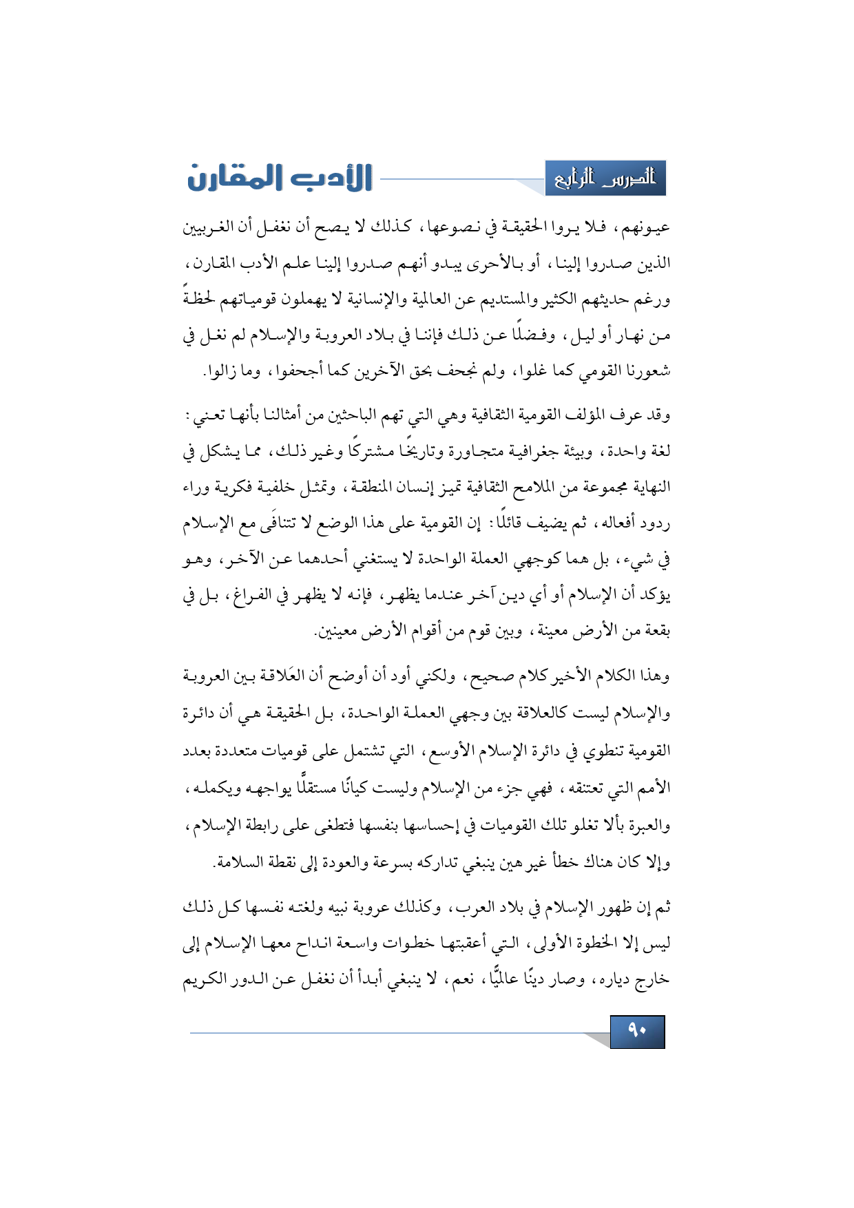 عيونهم، فلا يروا الحقيقة في نصوعها، كذلك لا يصح أن نغفل أن الغربيين الذين صدروا إلينا، أو بالأحرى يبدو أنهم صدروا إلينا علم الأدب المقارن، ورغم حديثهم الكثير والمستديم عن العالمية والإنسانية لا يهملون قومياتهم لحظةً من نهار أو ليل، وفضلًا عن ذلك فإننا في بلاد العروبة والإسلام لم نغل في شعورنا القومي كما غلوا، ولم نجحف بحق الآخرين كما أجحفوا، وما زالوا.