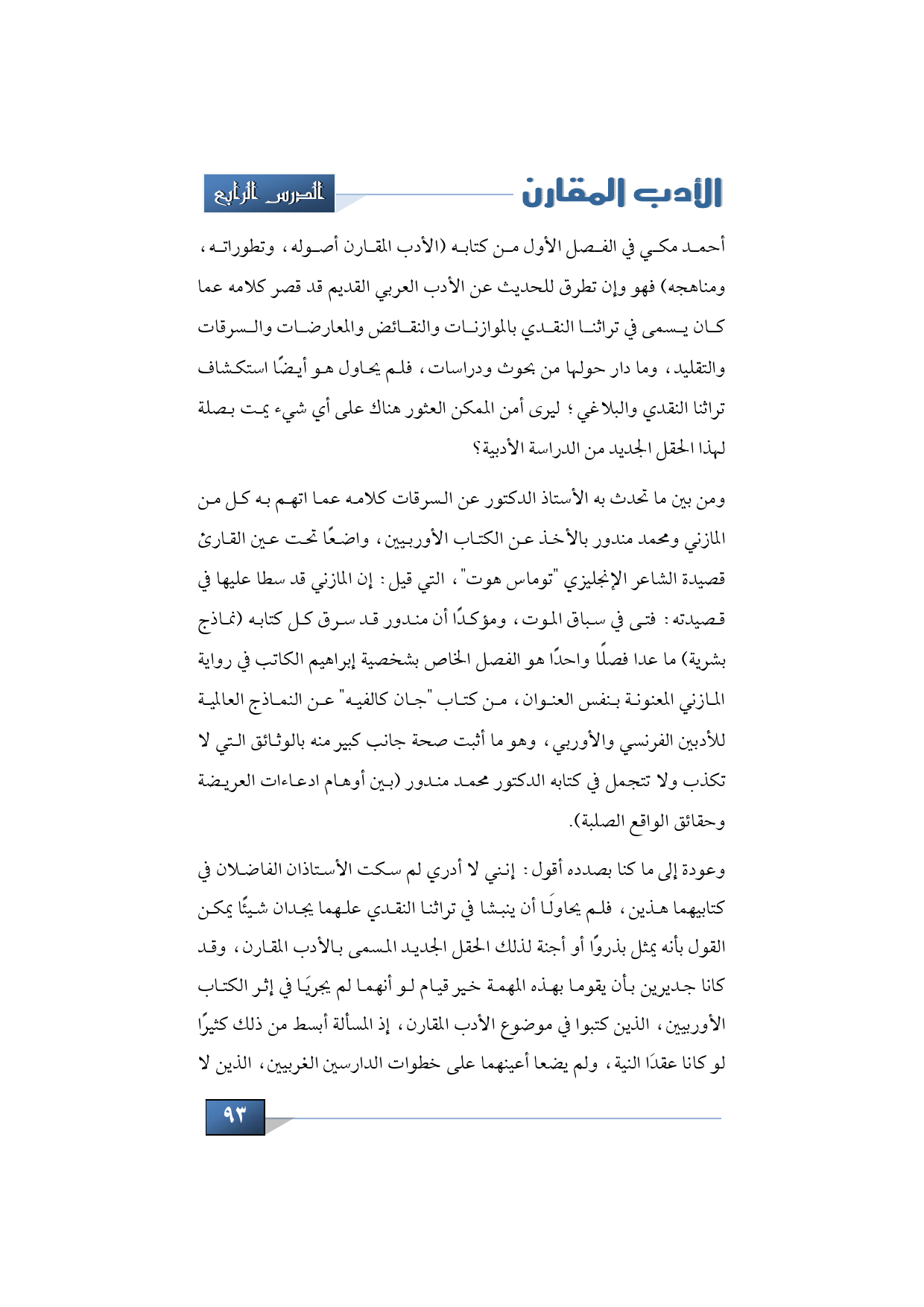 أحمد مكي في الفصل الأول من كتابه (الأدب المقارن أصوله، وتطوراته، ومناهجه) فهو وإن تطرق للحديث عن الأدب العربي القديم قد قصر كلامه عما كان يسمى في تراثنا النقدي بالموازنات والنقائض والمعارضات والسرقات والتقليد، وما دار حولها من بحوث ودراسات، فلم يحاول هو أيضًا استكشاف تراثنا النقدي والبلاغي؛ ليرى أمن الممكن العثور هناك على أي شيء يمت بصلة لهذا الحقل الجديد من الدراسة الأدبية.