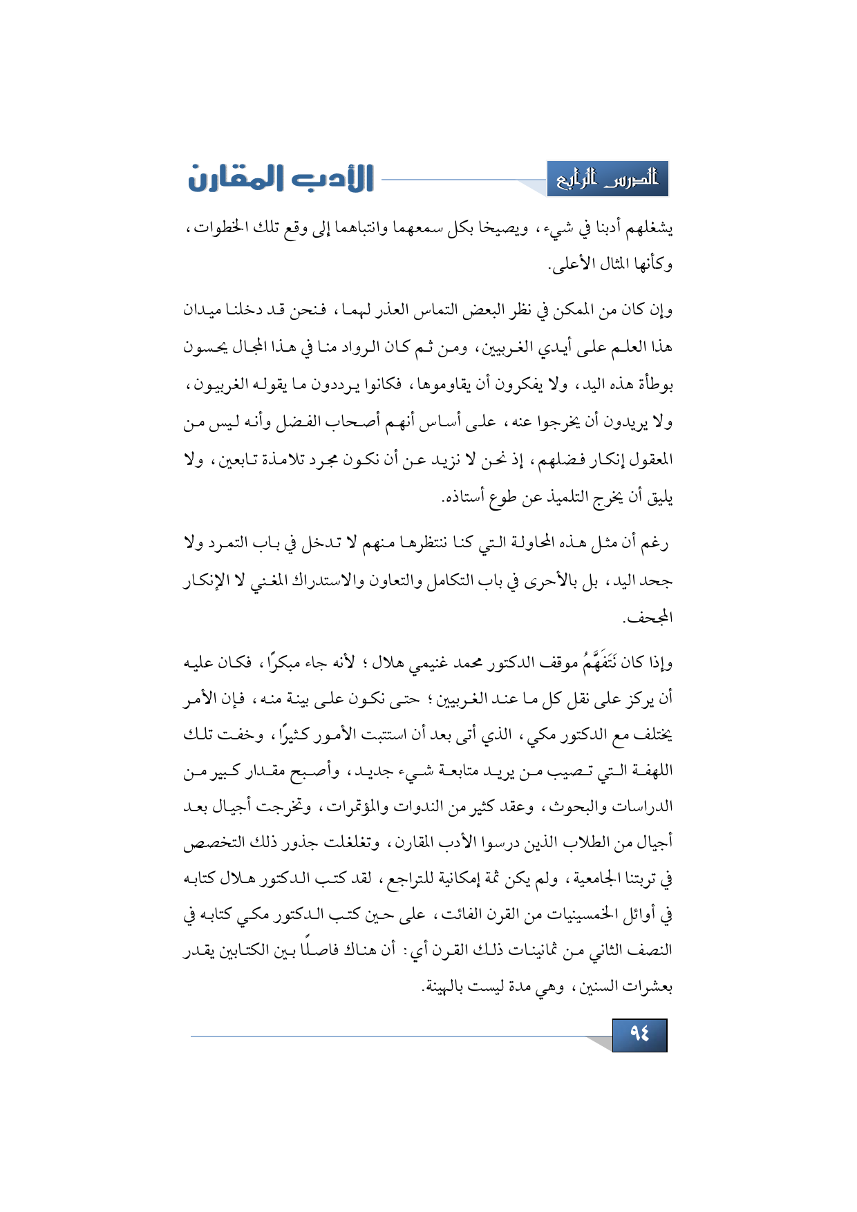 وإذا كان نَتَفَهَّمُ موقف الدكتور محمد غنيمي هلال؛ لأنه جاء مبكرًا، فكان عليه أن يركز على نقل كل ما عند الغربيين؛ حتى نكون على بينة منه، فإن الأمر يختلف مع الدكتور مكي، الذي أتى بعد أن استتبت الأمور كثيرًا، وخفت تلك اللهفة التي تصيب من يريد متابعة شيء جديد، وأصبح مقدار كبير من الدراسات والبحوث، وعقد كثير من الندوات والمؤتمرات، وتخرجت أجيال بعد أجيال من الطلاب الذين درسوا الأدب المقارن، وتغلغلت جذور ذلك التخصص في تربتنا الجامعية، ولم يكن ثمة إمكانية للتراجع، لقد كتب الدكتور هلال كتابه في أوائل الخمسينيات من القرن الفائت، على حين كتب الدكتور مكي كتابه في النصف الثاني من ثمانينات ذلك القرن أي: أن هناك فاصلًا بين الكتابين يقدر بعشرات السنين، وهي مدة ليست بالهينة.
