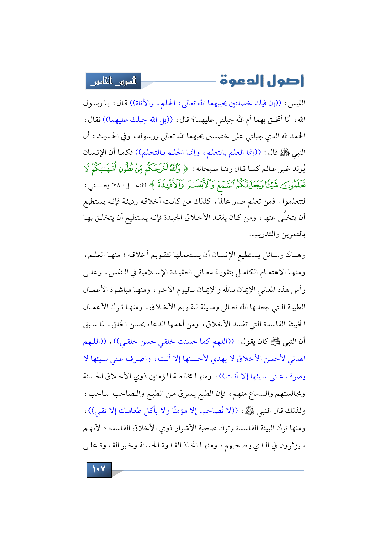 القيس: ((إن فيك خصلتين يحيبهما الله تعالى: الحلم، والأناة)) قال: يا رسول الله، أنا أتخلق بهما أم الله جبلني عليهما؟ قال: ((بل الله جبلك عليهما)) فقال: الحمد لله الذي جبلني على خصلتين يحبهما الله تعالى ورسوله، وفي الحديث: أن النبي -صلى الله عليه وسلم- قال: ((إنما العلم بالتعلم، وإنما الحلم بالتحلم)) فكما أن الإنسان يُولد غير عالم كما قال ربنا سبحانه: {وَاللَّهُ أَخْرَجَكُمْ مِنْ بُطُونِ أُمَّهَاتِكُمْ لَا تَعْلَمُونَ شَيْئًا وَجَعَلَ لَكُمُ السَّمْعَ وَالْأَبْصَارَ وَالْأَفْئِدَةَ} (النحل: 78) يعني: لتتعلموا، فمن تعلم صار عالمًا، كذلك من كانت أخلاقه رديئة فإنه يستطيع أن يتخلَّى عنها، ومن كان يفقد الأخلاق الجيدة فإنه يستطيع أن يتخلق بها بالتمرين والتدريب.