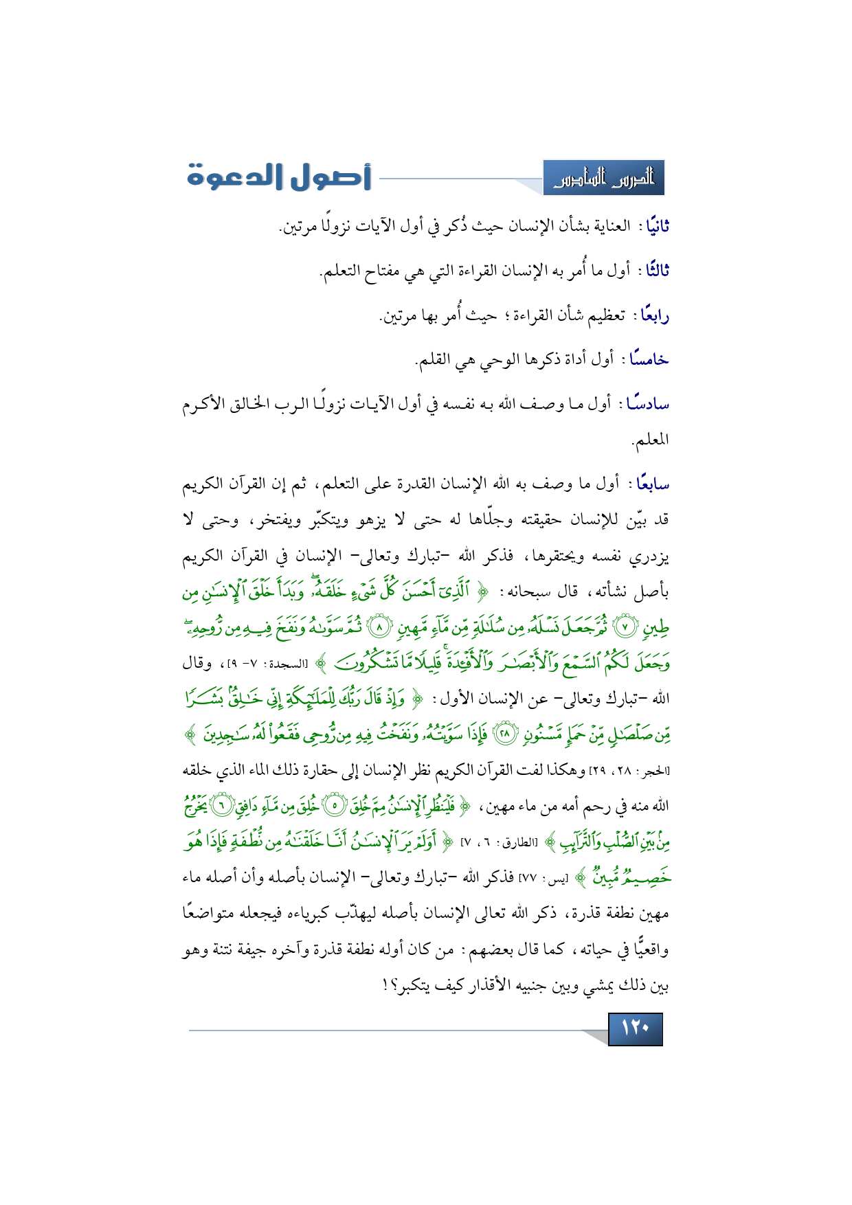 سابعًا: أول ما وصف به الله الإنسان القدرة على التعلم، ثم إن القرآن الكريم قد بيّن للإنسان حقيقته وجلّاها له حتى لا يزهو ويتكبّر ويفتخر، وحتى لا يزدري نفسه ويحتقرها، فذكر الله -تبارك وتعالى- الإنسان في القرآن الكريم بأصل نشأته، قال سبحانه: {الَّذِي أَحْسَنَ كُلَّ شَيْءٍ خَلَقَهُ وَبَدَأَ خَلْقَ الْإِنْسَانِ مِنْ طِينٍ * ثُمَّ جَعَلَ نَسْلَهُ مِنْ سُلَالَةٍ مِنْ مَاءٍ مَهِينٍ * ثُمَّ سَوَّاهُ وَنَفَخَ فِيهِ مِنْ رُوحِهِ وَجَعَلَ لَكُمُ السَّمْعَ وَالْأَبْصَارَ وَالْأَفْئِدَةَ قَلِيلًا مَا تَشْكُرُونَ} (السجدة: 7 - 9)، وقال الله -تبارك وتعالى- عن الإنسان الأول: {وَإِذْ قَالَ رَبُّكَ لِلْمَلَائِكَةِ إِنِّي خَالِقٌ بَشَرًا مِنْ صَلْصَالٍ مِنْ حَمَإٍ مَسْنُونٍ * فَإِذَا سَوَّيْتُهُ وَنَفَخْتُ فِيهِ مِنْ رُوحِي فَقَعُوا لَهُ سَاجِدِينَ} (الحجر: 28، 29) وهكذا لفت القرآن الكريم نظر الإنسان إلى حقارة ذلك الماء الذي خلقه الله منه في رحم أمه من ماء مهين، {فَلْيَنظُرِ الإِنسَانُ مِمَّ خُلِق * خُلِقَ مِن مَّاء دَافِق * يَخْرُجُ مِن بَيْنِ الصُّلْبِ وَالتَّرَائِب} (الطارق: 6، 7) {أَوَلَمْ يَرَ الإِنسَانُ أَنَّا خَلَقْنَاهُ مِن نُّطْفَةٍ فَإِذَا هُوَ خَصِيمٌ مُّبِين} (يس: 77) فذكر الله -تبارك وتعالى- الإنسان بأصله وأن أصله ماء مهين نطفة قذرة، ذكر الله تعالى الإنسان بأصله ليهذّب كبرياءه فيجعله متواضعًا واقعيًّا في حياته، كما قال بعضهم: من كان أوله نطفة قذرة وآخره جيفة نتنة وهو بين ذلك يمشي وبين جنبيه الأقذار كيف يتكبر؟!