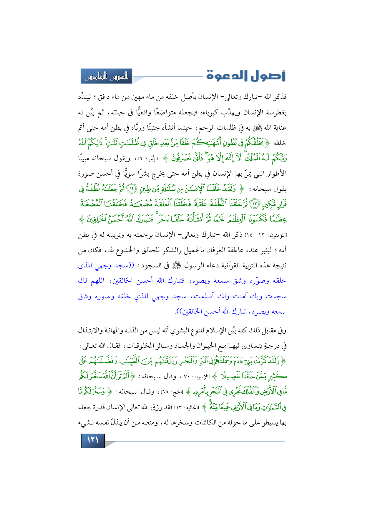 فذكر الله -تبارك وتعالى- الإنسان بأصل خلقه من ماء مهين من ماء دافق؛ ليندِّد بغطرسة الإنسان ويهذّب كبرياءه فيجعله متواضعًا واقعيًّا في حياته، ثم بيَّن له عناية الله -عز وجل- به في ظلمات الرحم، حينما أنشأه جنينًا وربَّاه في بطن أمه حتى أتم خلقه {يَخْلُقُكُمْ فِي بُطُونِ أُمَّهَاتِكُمْ خَلْقًا مِن بَعْدِ خَلْقٍ فِي ظُلُمَاتٍ ثَلاَثٍ ذَلِكُمُ اللَّهُ رَبُّكُمْ لَهُ الْمُلْكُ لاَ إِلَهَ إِلاَّ هُوَ فَأَنَّى تُصْرَفُون} (الزُّمَر: 6)، ويقول سبحانه مبينًا الأطوار التي يمرّ بها الإنسان في بطن أمه حتى يخرج بشرًا سويًّا في أحسن صورة يقول سبحانه: {وَلَقَدْ خَلَقْنَا الْإِنْسَانَ مِنْ سُلَالَةٍ مِنْ طِينٍ * ثُمَّ جَعَلْنَاهُ نُطْفَةً فِي قَرَارٍ مَكِينٍ * ثُمَّ خَلَقْنَا النُّطْفَةَ عَلَقَةً فَخَلَقْنَا الْعَلَقَةَ مُضْغَةً فَخَلَقْنَا الْمُضْغَةَ عِظَامًا فَكَسَوْنَا الْعِظَامَ لَحْمًا ثُمَّ أَنْشَأْنَاهُ خَلْقًا آخَرَ فَتَبَارَكَ اللَّهُ أَحْسَنُ الْخَالِقِينَ} (المؤمنون: 12 - 14) ذكر الله -تبارك وتعالى- الإنسان برحمته به وتربيته له في بطن أمه؛ ليثير عنده عاطفة العرفان بالجميل والشكر للخالق والخشوع لله، فكان من نتيجة هذه التربية القرآنية دعاء الرسول -صلى الله عليه وسلم- في السجود: ((سجد وجهي للذي خلقه وصوّره وشق سمعه وبصره، فتبارك الله أحسن الخالقين، اللهم لك سجدت وبك آمنت ولك أسلمت، سجد وجهي للذي خلقه وصوره وشق سمعه وبصره، تبارك الله أحسن الخالقين)).