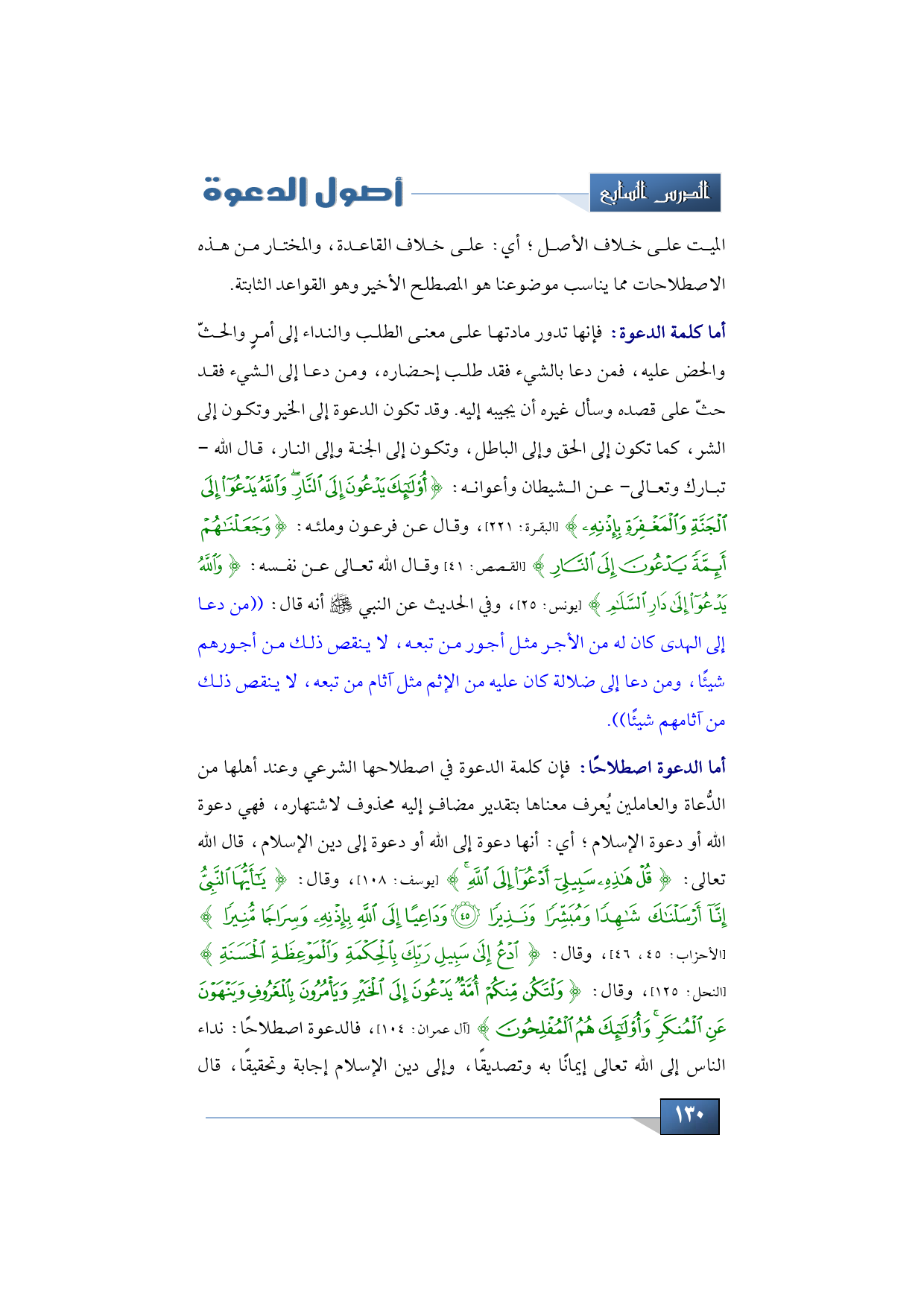 أما كلمة الدعوة: فإنها تدور مادتها على معنى الطلب والنداء إلى أمرٍ والحثّ والحض عليه، فمن دعا بالشيء فقد طلب إحضاره، ومن دعا إلى الشيء فقد حثّ على قصده وسأل غيره أن يجيبه إليه. وقد تكون الدعوة إلى الخير وتكون إلى الشر، كما تكون إلى الحق وإلى الباطل، وتكون إلى الجنة وإلى النار، قال الله -تبارك وتعالى- عن الشيطان وأعوانه: {أُولَئِكَ يَدْعُونَ إِلَى النَّارِ وَاللَّهُ يَدْعُو إِلَى الْجَنَّةِ وَالْمَغْفِرَةِ بِإِذْنِهِ} (البقرة: 221)، وقال عن فرعون وملئه: {وَجَعَلْنَاهُمْ أَئِمَّةً يَدْعُونَ إِلَى النَّارِ} (القصص: 41) وقال الله تعالى عن نفسه: {وَاللَّهُ يَدْعُو إِلَى دَارِ السَّلَامِ} (يونس: 25)، وفي الحديث عن النبي -صلى الله عليه وسلم- أنه قال: ((من دعا إلى الهدى كان له من الأجر مثل أجور من تبعه، لا ينقص ذلك من أجورهم شيئًا، ومن دعا إلى ضلالة كان عليه من الإثم مثل آثام من تبعه، لا ينقص ذلك من آثامهم شيئًا)).