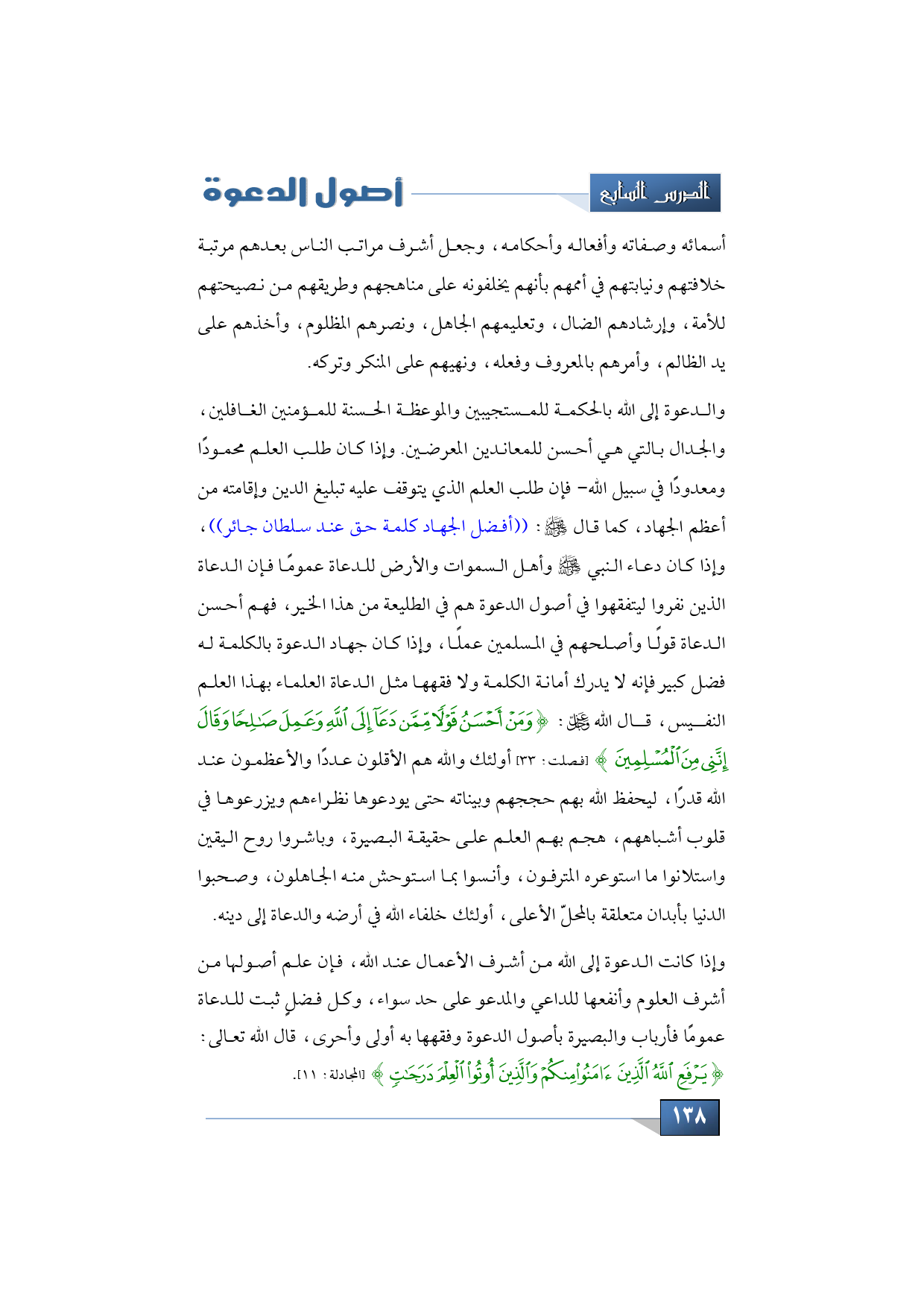 والدعوة إلى الله بالحكمة للمستجيبين والموعظة الحسنة للمؤمنين الغافلين، والجدال بالتي هي أحسن للمعاندين المعرضين. وإذا كان طلب العلم محمودًا ومعدودًا في سبيل الله- فإن طلب العلم الذي يتوقف عليه تبليغ الدين وإقامته من أعظم الجهاد، كما قال صلى الله عليه وسلم: ((أفضل الجهاد كلمة حق عند سلطان جائر))، وإذا كان دعاء النبي -صلى الله عليه وسلم- وأهل السموات والأرض للدعاة عمومًا فإن الدعاة الذين نفروا ليتفقهوا في أصول الدعوة هم في الطليعة من هذا الخير، فهم أحسن الدعاة قولًا وأصلحهم في المسلمين عملًا، وإذا كان جهاد الدعوة بالكلمة له فضل كبير فإنه لا يدرك أمانة الكلمة ولا فقهها مثل الدعاة العلماء بهذا العلم النفيس، قال الله -عز وجل-: {وَمَنْ أَحْسَنُ قَوْلًا مِمَّنْ دَعَا إِلَى اللَّهِ وَعَمِلَ صَالِحًا وَقَالَ إِنَّنِي مِنَ الْمُسْلِمِينَ} (فصلت: 33) أولئك والله هم الأقلون عددًا والأعظمون عند الله قدرًا، ليحفظ الله بهم حججهم وبيناته حتى يودعوها نظراءهم ويزرعوها في قلوب أشباههم، هجم بهم العلم على حقيقة البصيرة، وباشروا روح اليقين واستلانوا ما استوعره المترفون، وأنسوا بما استوحش منه الجاهلون، وصحبوا الدنيا بأبدان متعلقة بالمحلّ الأعلى، أولئك خلفاء الله في أرضه والدعاة إلى دينه.