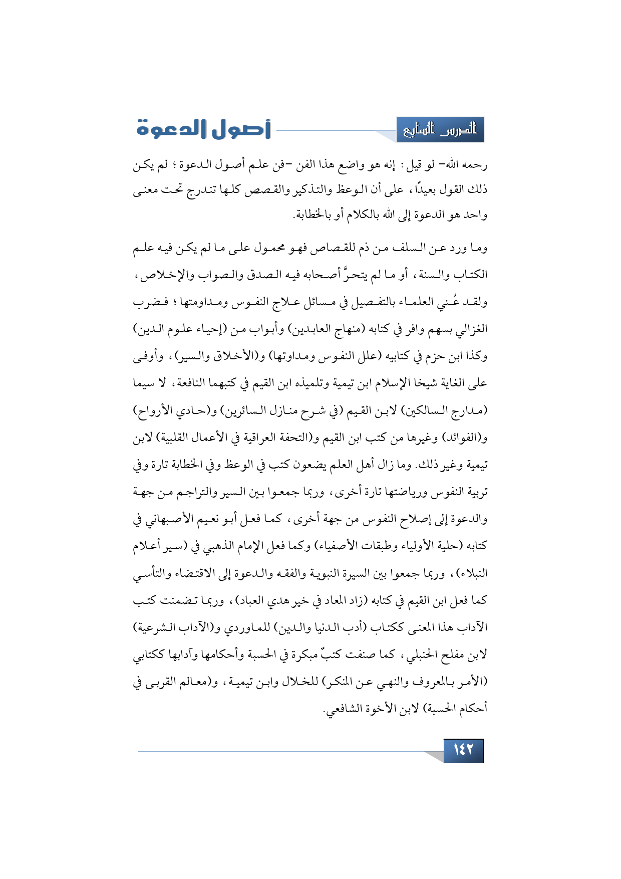وما ورد عن السلف من ذم للقصاص فهو محمول على ما لم يكن فيه علم الكتاب والسنة، أو ما لم يتحرَّ أصحابه فيه الصدق والصواب والإخلاص، ولقد عُني العلماء بالتفصيل في مسائل علاج النفوس ومداومتها؛ فضرب الغزالي بسهم وافر في كتابه (منهاج العابدين) وأبواب من (إحياء علوم الدين) وكذا ابن حزم في كتابيه (علل النفوس ومداوتها) و (الأخلاق والسير)، وأوفى على الغاية شيخا الإسلام ابن تيمية وتلميذه ابن القيم في كتبهما النافعة، لا سيما (مدارج السالكين) لابن القيم (في شرح منازل السائرين) و (حادي الأرواح) و (الفوائد) وغيرها من كتب ابن القيم و (التحفة العراقية في الأعمال القلبية) لابن تيمية وغير ذلك. وما زال أهل العلم يضعون كتب في الوعظ وفي الخطابة تارة وفي تربية النفوس ورياضتها تارة أخرى، وربما جمعوا بين السير والتراجم من جهة والدعوة إلى إصلاح النفوس من جهة أخرى، كما فعل أبو نعيم الأصبهاني في كتابه (حلية الأولياء وطبقات الأصفياء) وكما فعل الإمام الذهبي في (سير أعلام النبلاء)، وربما جمعوا بين السيرة النبوية والفقه والدعوة إلى الاقتضاء والتأسي كما فعل ابن القيم في كتابه (زاد المعاد في خير هدي العباد)، وربما تضمنت كتب الآداب هذا المعنى ككتاب (أدب الدنيا والدين) للماوردي و (الآداب الشرعية) لابن مفلح الحنبلي، كما صنفت كتبٌ مبكرة في الحسبة وأحكامها وآدابها ككتابي (الأمر بالمعروف والنهي عن المنكر) للخلال وابن تيمية، و (معالم القربى في أحكام الحسبة) لابن الأخوة الشافعي.