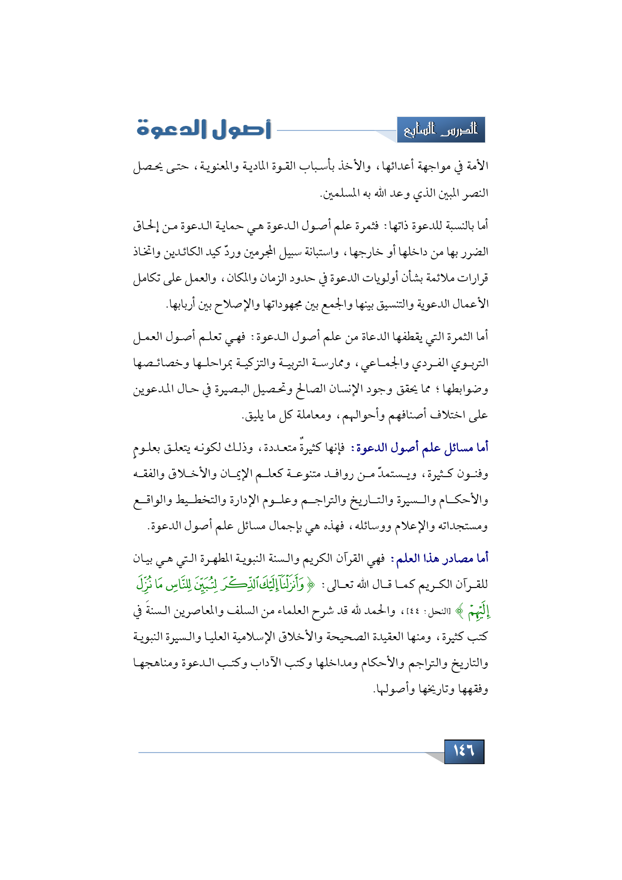 أما مصادر هذا العلم فهي القرآن الكريم والسنة النبوية المطهرة التي هي بيان للقرآن الكريم كما قال الله تعالى: {وَأَنْزَلْنَا إِلَيْكَ الذِّكْرَ لِتُبَيِّنَ لِلنَّاسِ مَا نُزِّلَ إِلَيْهِمْ} (النحل: 44)، والحمد لله قد شرح العلماء من السلف والمعاصرين السنةَ في كتب كثيرة، ومنها العقيدة الصحيحة والأخلاق الإسلامية العليا والسيرة النبوية والتاريخ والتراجم والأحكام ومداخلها وكتب الآداب وكتب الدعوة ومناهجها وفقهها وتاريخها وأصولها.
