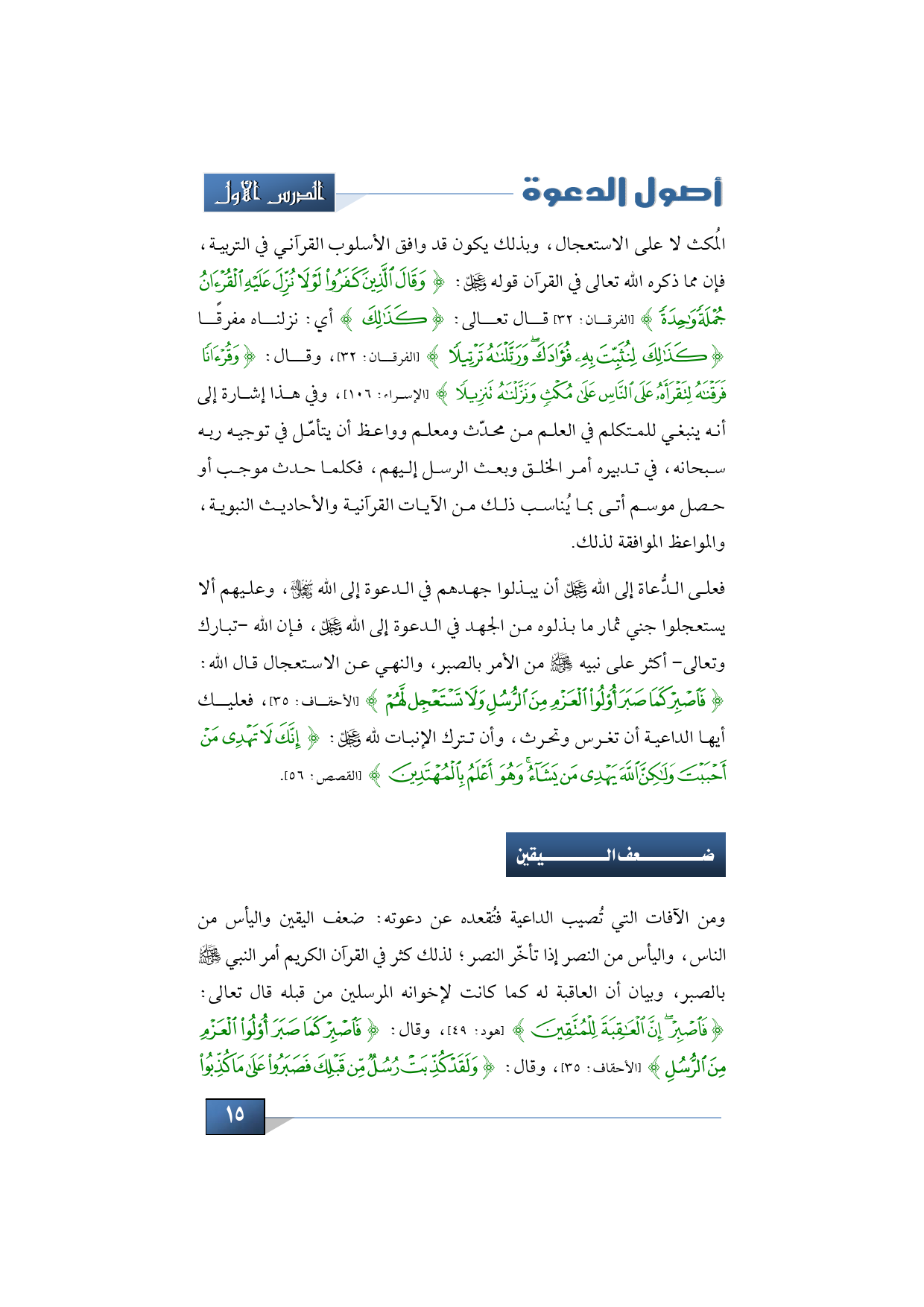 المُكث لا على الاستعجال، وبذلك يكون قد وافق الأسلوب القرآني في التربية، فإن مما ذكره الله تعالى في القرآن قوله -عز وجل-: {وَقَالَ الَّذِينَ كَفَرُوا لَوْلَا نُزِّلَ عَلَيْهِ الْقُرْآنُ جُمْلَةً وَاحِدَةً} (الفرقان: 32) قال تعالى: {كَذَلِكَ} أي: نزلناه مفرقًا {كَذَلِكَ لِنُثَبِّتَ بِهِ فُؤَادَكَ وَرَتَّلْنَاهُ تَرْتِيلًا} (الفرقان: 32)، وقال: {وَقُرْآنًا فَرَقْنَاهُ لِتَقْرَأَهُ عَلَى النَّاسِ عَلَى مُكْثٍ وَنَزَّلْنَاهُ تَنْزِيلًا} (الإسراء: 106)، وفي هذا إشارة إلى أنه ينبغي للمتكلم في العلم من محدّث ومعلم وواعظ أن يتأمّل في توجيه ربه سبحانه، في تدبيره أمر الخلق وبعث الرسل إليهم، فكلما حدث موجب أو حصل موسم أتى بما يُناسب ذلك من الآيات القرآنية والأحاديث النبوية، والمواعظ الموافقة لذلك.