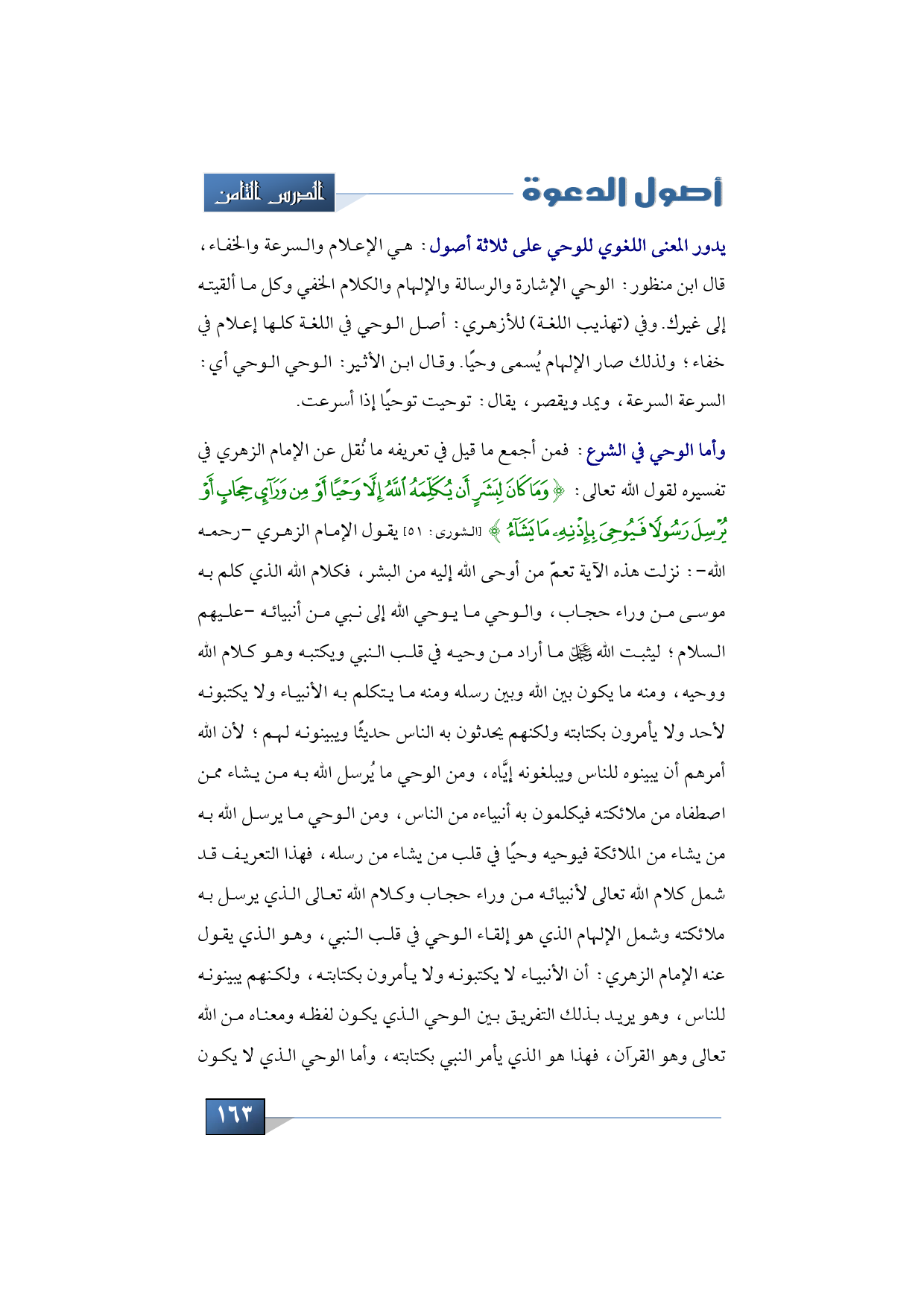 وأما الوحي في الشرع، فمن أجمع ما قيل في تعريفه ما نُقل عن الإمام الزهري في تفسيره لقول الله تعالى: {وَمَا كَانَ لِبَشَرٍ أَنْ يُكَلِّمَهُ اللَّهُ إِلَّا وَحْيًا أَوْ مِنْ وَرَاءِ حِجَابٍ أَوْ يُرْسِلَ رَسُولًا فَيُوحِيَ بِإِذْنِهِ مَا يَشَاءُ} (الشورى: 51) يقول الإمام الزهري -رحمه الله-: نزلت هذه الآية تعمّ من أوحى الله إليه من البشر، فكلام الله الذي كلم به موسى من وراء حجاب، والوحي ما يوحي الله إلى نبي من أنبيائه -عليهم السلام؛ ليثبت الله -عز وجل- ما أراد من وحيه في قلب النبي ويكتبه وهو كلام الله ووحيه، ومنه ما يكون بين الله وبين رسله ومنه ما يتكلم به الأنبياء ولا يكتبونه لأحد ولا يأمرون بكتابته ولكنهم يحدثون به الناس حديثًا ويبينونه لهم؛ لأن الله أمرهم أن يبينوه للناس ويبلغونه إيَّاه، ومن الوحي ما يُرسل الله به من يشاء ممن اصطفاه من ملائكته فيكلمون به أنبياءه من الناس، ومن الوحي ما يرسل الله به من يشاء من الملائكة فيوحيه وحيًا في قلب من يشاء من رسله، فهذا التعريف قد شمل كلام الله تعالى لأنبيائه من وراء حجاب وكلام الله تعالى الذي يرسل به ملائكته وشمل الإلهام الذي هو إلقاء الوحي في قلب النبي، وهو الذي يقول عنه الإمام الزهري: أن الأنبياء لا يكتبونه ولا يأمرون بكتابته، ولكنهم يبينونه للناس، وهو يريد بذلك التفريق بين الوحي الذي يكون لفظه ومعناه من الله تعالى وهو القرآن، فهذا هو الذي يأمر النبي بكتابته، وأما الوحي الذي لا يكون