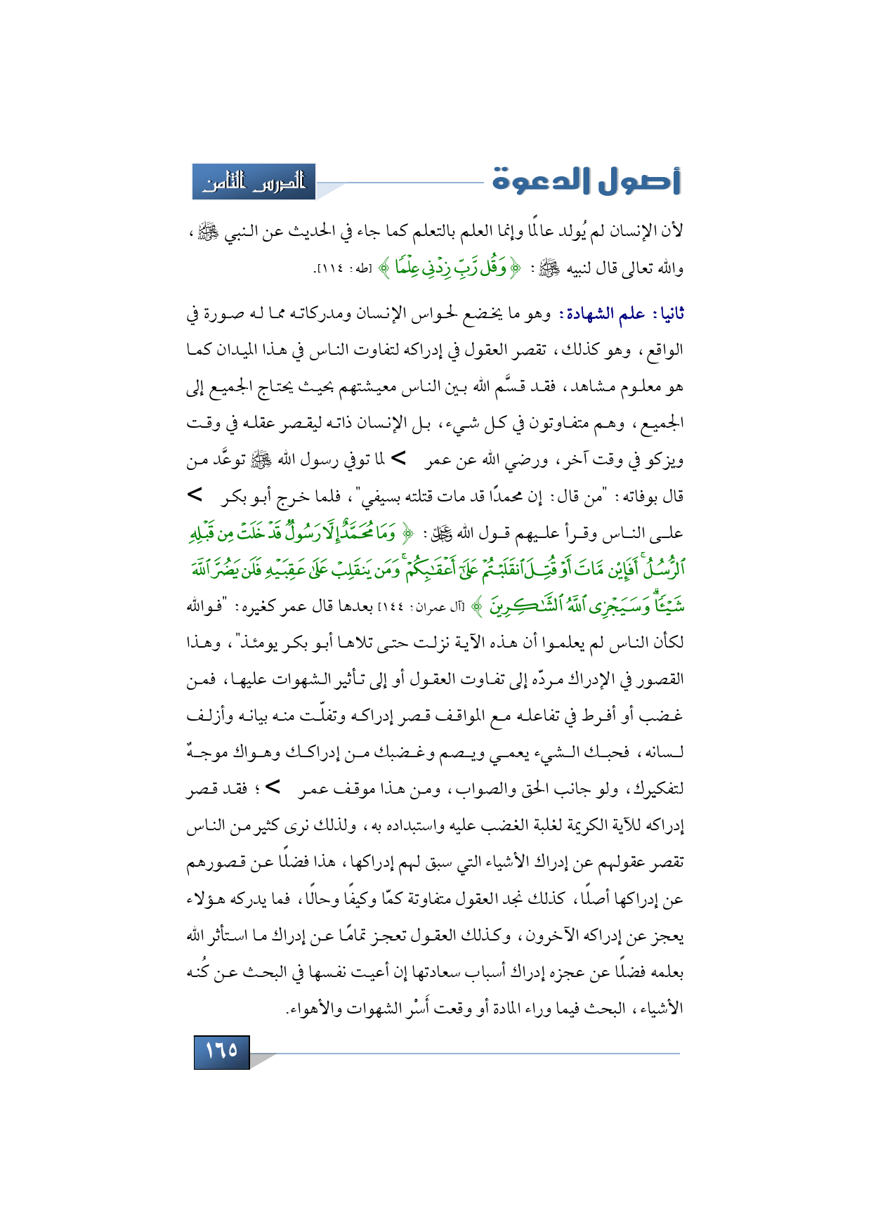 ثانيا: علم الشهادة: وهو ما يخضع لحواس الإنسان ومدركاته مما له صورة في الواقع، وهو كذلك، تقصر العقول في إدراكه لتفاوت الناس في هذا الميدان كما هو معلوم مشاهد، فقد قسَّم الله بين الناس معيشتهم بحيث يحتاج الجميع إلى الجميع، وهم متفاوتون في كل شيء، بل الإنسان ذاته ليقصر عقله في وقت ويزكو في وقت آخر، ورضي الله عن عمر -رضي الله عنه- لما توفي رسول الله -صلى الله عليه وسلم- توعَّد من قال بوفاته: "من قال: إن محمدًا قد مات قتلته بسيفي"، فلما خرج أبو بكر -رضي الله عنه- على الناس وقرأ عليهم قول الله عز وجل: {وَمَا مُحَمَّدٌ إِلَّا رَسُولٌ قَدْ خَلَتْ مِنْ قَبْلِهِ الرُّسُلُ أَفَإِنْ مَاتَ أَوْ قُتِلَ انْقَلَبْتُمْ عَلَى أَعْقَابِكُمْ وَمَنْ يَنْقَلِبْ عَلَى عَقِبَيْهِ فَلَنْ يَضُرَّ اللَّهَ شيئًا وَسَيَجْزِي اللَّهُ الشَّاكِرِينَ} (آل عمران: 144) بعدها قال عمر كغيره: "فوالله لكأن الناس لم يعلموا أن هذه الآية نزلت حتى تلاها أبو بكر يومئذ"، وهذا القصور في الإدراك مردّه إلى تفاوت العقول أو إلى تأثير الشهوات عليها، فمن غضب أو أفرط في تفاعله مع المواقف قصر إدراكه وتفلّت منه بيانه وأزلف لسانه، فحبك الشيء يعمي ويصم وغضبك من إدراكك وهواك موجهٌ لتفكيرك، ولو جانب الحق والصواب، ومن هذا موقف عمر -رضي الله عنه؛ فقد قصر إدراكه للآية الكريمة لغلبة الغضب عليه واستبداده به، ولذلك نرى كثير من الناس تقصر عقولهم عن إدراك الأشياء التي سبق لهم إدراكها، هذا فضلًا عن قصورهم عن إدراكها أصلًا، كذلك نجد العقول متفاوتة كمّا وكيفًا وحالًا، فما يدركه هؤلاء يعجز عن إدراكه الآخرون، وكذلك العقول تعجز تمامًا عن إدراك ما استأثر الله بعلمه فضلًا عن عجزه إدراك أسباب سعادتها إن أعيت نفسها في البحث عن كُنه الأشياء، البحث فيما وراء المادة أو وقعت أَسْر الشهوات والأهواء.