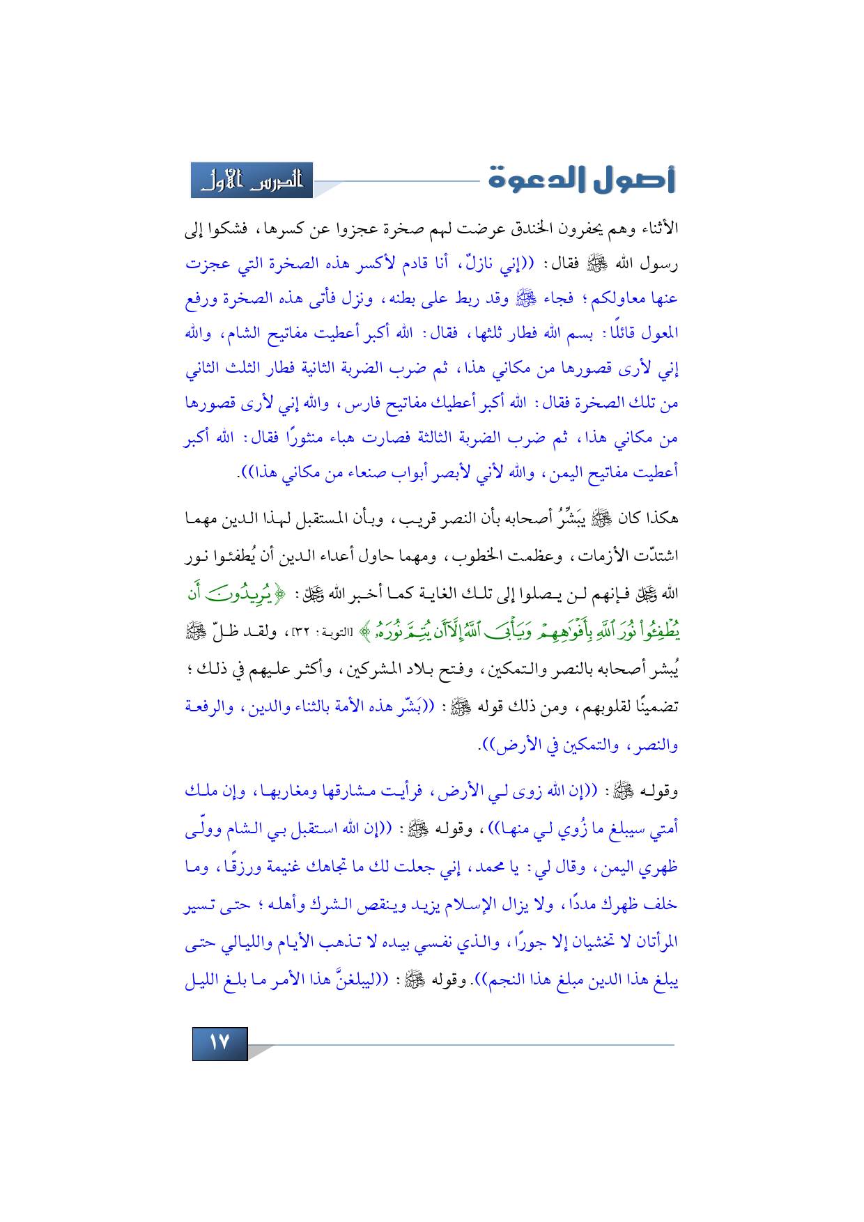 هكذا كان -صلى الله عليه وسلم- يبَشِّرُ أصحابه بأن النصر قريب، وبأن المستقبل لهذا الدين مهما اشتدّت الأزمات، وعظمت الخطوب، ومهما حاول أعداء الدين أن يُطفئوا نور الله -عز وجل- فإنهم لن يصلوا إلى تلك الغاية كما أخبر الله -عز وجل-: {يُرِيدُونَ أَنْ يُطْفِئُوا نُورَ اللَّهِ بِأَفْوَاهِهِمْ وَيَأْبَى اللَّهُ إِلَّا أَنْ يُتِمَّ نُورَهُ} (التوبة: 32)، ولقد ظلّ -صلى الله عليه وسلم- يُبشر أصحابه بالنصر والتمكين، وفتح بلاد المشركين، وأكثر عليهم في ذلك؛ تضمينًا لقلوبهم، ومن ذلك قوله -صلى الله عليه وسلم-: ((بَشّر هذه الأمة بالثناء والدين، والرفعة والنصر، والتمكين في الأرض)).