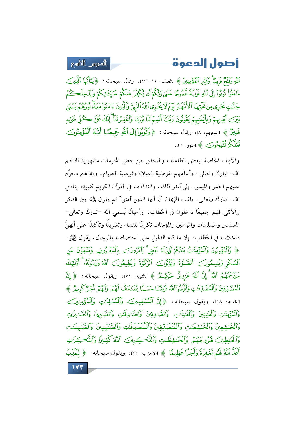 اللَّهِ وَفَتْحٌ قَرِيبٌ وَبَشِّرِ الْمُؤْمِنِينَ} (الصف: 10 - 13)، وقال سبحانه: {يَا أَيُّهَا الَّذِينَ آمَنُوا تُوبُوا إِلَى اللَّهِ تَوْبَةً نَصُوحًا عَسَى رَبُّكُمْ أَنْ يُكَفِّرَ عَنْكُمْ سَيِّئَاتِكُمْ وَيُدْخِلَكُمْ جَنَّاتٍ تَجْرِي مِنْ تَحْتِهَا الْأَنْهَارُ يَوْمَ لَا يُخْزِي اللَّهُ النَّبِيَّ وَالَّذِينَ آمَنُوا مَعَهُ نُورُهُمْ يَسْعَى بَيْنَ أَيْدِيهِمْ وَبِأَيْمَانِهِمْ يَقُولُونَ رَبَّنَا أَتْمِمْ لَنَا نُورَنَا وَاغْفِرْ لَنَا إِنَّكَ عَلَى كُلِّ شَيْءٍ قَدِيرٌ} (التحريم: 8)، وقال سبحانه: {وَتُوبُوا إِلَى اللَّهِ جَمِيعًا أَيُّهَ الْمُؤْمِنُونَ لَعَلَّكُمْ تُفْلِحُونَ} (النور: 31).