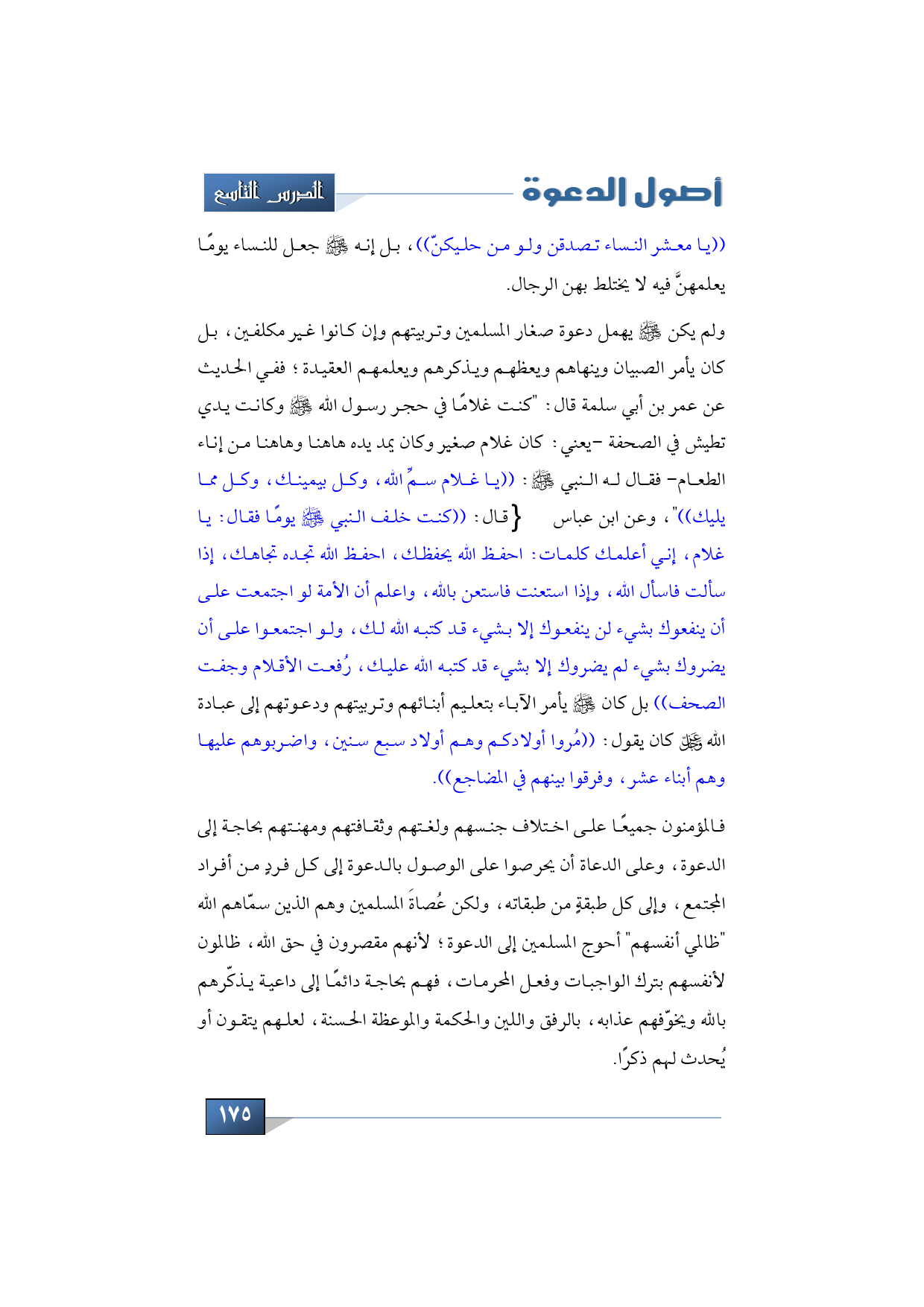 ولم يكن -صلى الله عليه وسلم- يهمل دعوة صغار المسلمين وتربيتهم وإن كانوا غير مكلفين، بل كان يأمر الصبيان وينهاهم ويعظهم ويذكرهم ويعلمهم العقيدة؛ ففي الحديث عن عمر بن أبي سلمة قال: "كنت غلامًا في حجر رسول الله -صلى الله عليه وسلم- وكانت يدي تطيش في الصحفة -يعني: كان غلام صغير وكان يمد يده هاهنا وهاهنا من إناء الطعام- فقال له النبي -صلى الله عليه وسلم-: ((يا غلام سمِّ الله، وكل بيمينك، وكل مما يليك)) "، وعن ابن عباس -رضي الله عنهما- قال: ((كنت خلف النبي -صلى الله عليه وسلم- يومًا فقال: يا غلام، إني أعلمك كلمات: احفظ الله يحفظك، احفظ الله تجده تجاهك، إذا سألت فاسأل الله، وإذا استعنت فاستعن بالله، واعلم أن الأمة لو اجتمعت على أن ينفعوك بشيء لن ينفعوك إلا بشيء قد كتبه الله لك، ولو اجتمعوا على أن يضروك بشيء لم يضروك إلا بشيء قد كتبه الله عليك، رُفعت الأقلام وجفت الصحف)) بل كان -عليه الصلاة والسلام- يأمر الآباء بتعليم أبنائهم وتربيتهم ودعوتهم إلى عبادة الله -عز وجل- كان يقول: ((مُروا أولادكم وهم أولاد سبع سنين، واضربوهم عليها وهم أبناء عشر، وفرقوا بينهم في المضاجع)).