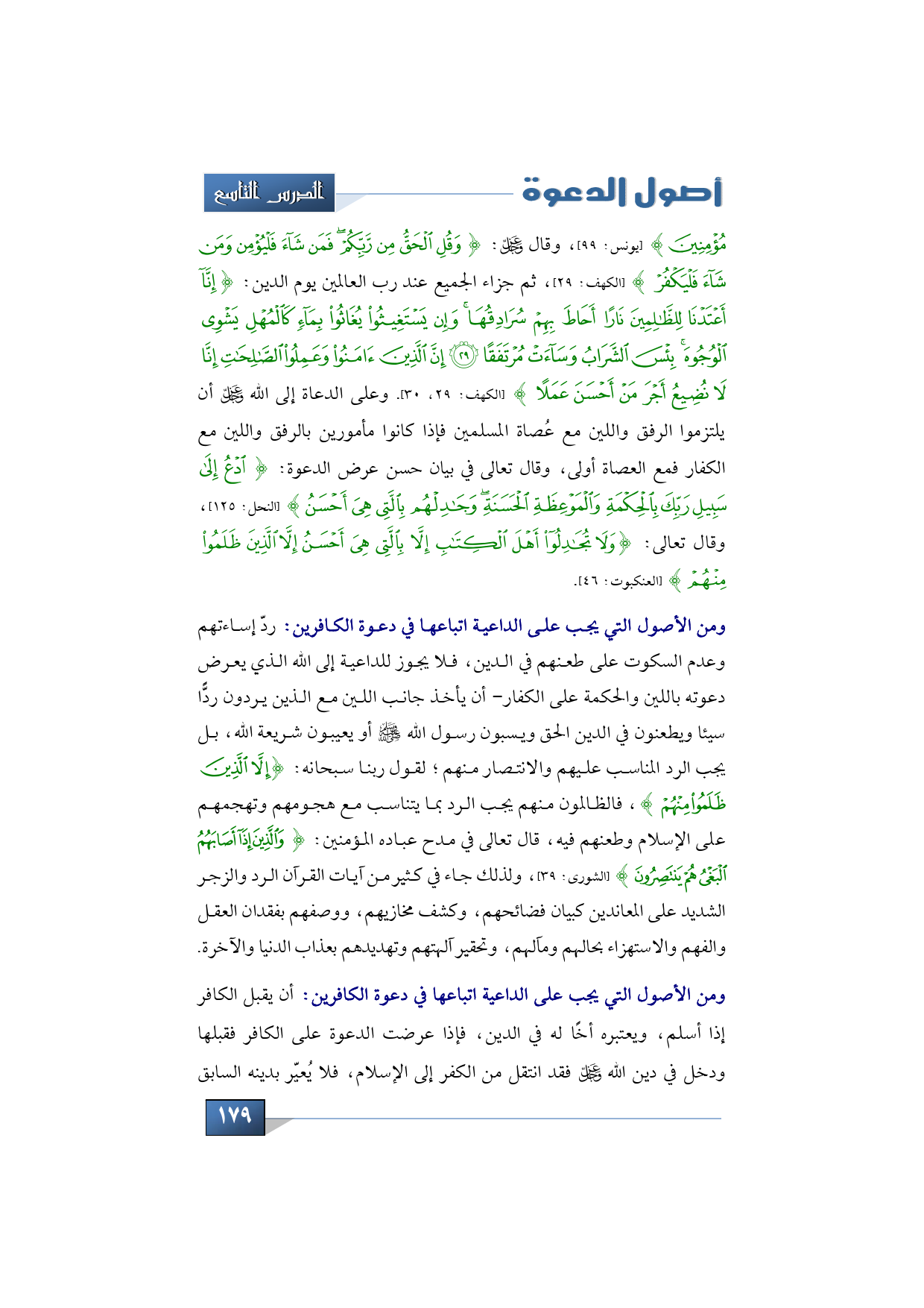 مُؤْمِنِينَ} (يونس: 99)، وقال -سبحانه وتعالى-: {وَقُلِ الْحَقُّ مِنْ رَبِّكُمْ فَمَنْ شَاءَ فَلْيُؤْمِنْ وَمَنْ شَاءَ فَلْيَكْفُرْ} (الكهف: 29)، ثم جزاء الجميع عند رب العالمين يوم الدين: {إِنَّا أَعْتَدْنَا لِلظَّالِمِينَ نَارًا أَحَاطَ بِهِمْ سُرَادِقُهَا وَإِنْ يَسْتَغِيثُوا يُغَاثُوا بِمَاءٍ كَالْمُهْلِ يَشْوِي الْوُجُوهَ بِئْسَ الشَّرَابُ وَسَاءَتْ مُرْتَفَقًا * إِنَّ الَّذِينَ آمَنُوا وَعَمِلُوا الصَّالِحَاتِ إِنَّا لَا نُضِيعُ أَجْرَ مَنْ أَحْسَنَ عَمَلًا} (الكهف: 29، 30). وعلى الدعاة إلى الله -عز وجل- أن يلتزموا الرفق واللين مع عُصاة المسلمين فإذا كانوا مأمورين بالرفق واللين مع الكفار فمع العصاة أولى، وقال تعالى في بيان حسن عرض الدعوة: {ادْعُ إِلَى سَبِيلِ رَبِّكَ بِالْحِكْمَةِ وَالْمَوْعِظَةِ الْحَسَنَةِ وَجَادِلْهُمْ بِالَّتِي هِيَ أَحْسَنُ} (النحل: 125)، وقال تعالى: {وَلَا تُجَادِلُوا أَهْلَ الْكِتَابِ إِلَّا بِالَّتِي هِيَ أَحْسَنُ إِلَّا الَّذِينَ ظَلَمُوا مِنْهُمْ} (العنكبوت: 46).