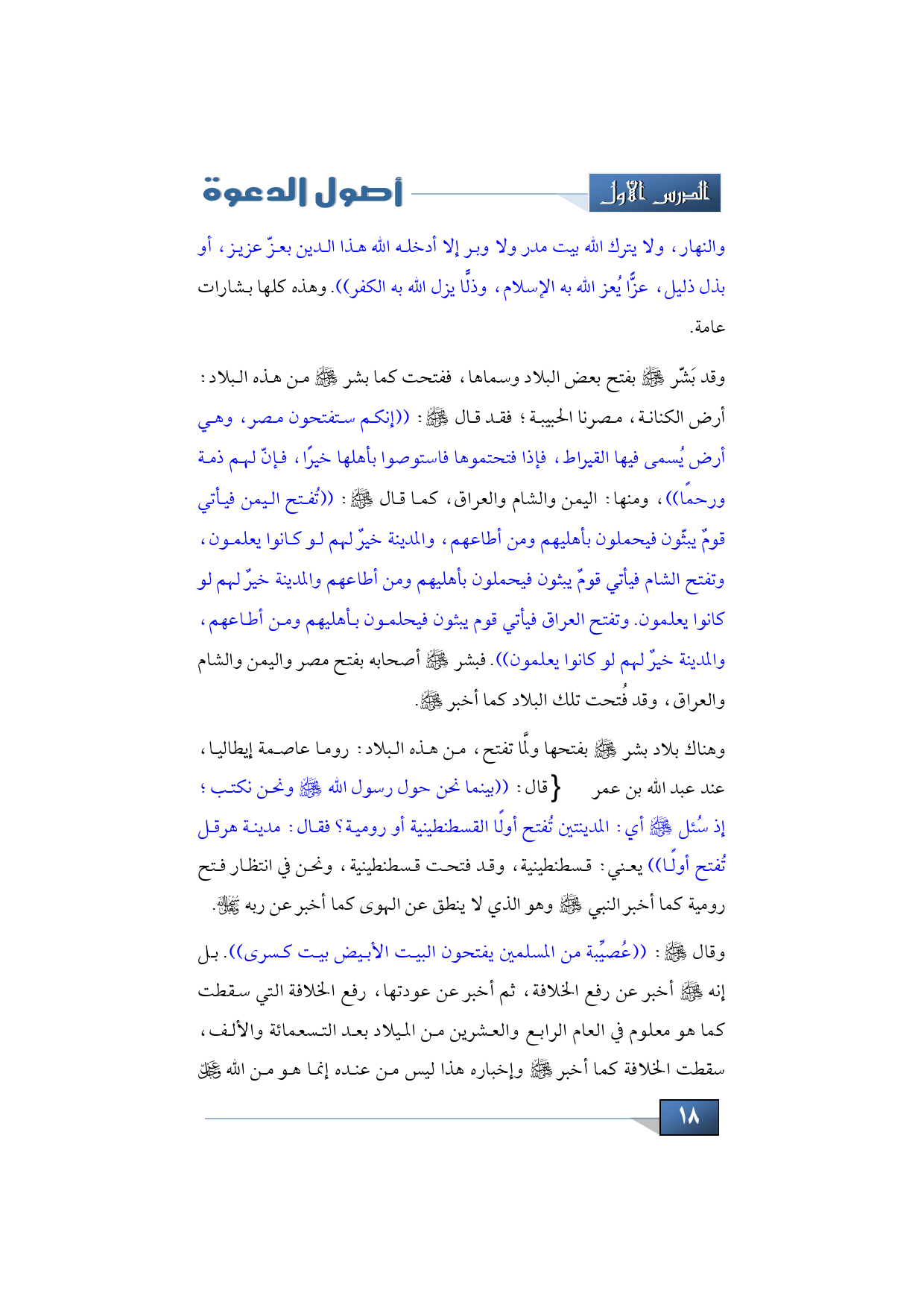 وهناك بلاد بشر -صلى الله عليه وسلم- بفتحها ولمَّا تفتح، من هذه البلاد: روما عاصمة إيطاليا، عند عبد الله بن عمر -رضي الله عنهما- قال: ((بينما نحن حول رسول الله -صلى الله عليه وسلم- ونحن نكتب؛ إذ سُئل -صلى الله عليه وسلم- أي: المدينتين تُفتح أولًا القسطنطينية أو رومية؟ فقال: مدينة هرقل تُفتح أولًا)) يعني: قسطنطينية، وقد فتحت قسطنطينية، ونحن في انتظار فتح رومية كما أخبر النبي -صلى الله عليه وسلم- وهو الذي لا ينطق عن الهوى كما أخبر عن ربه -سبحانه وتعالى.